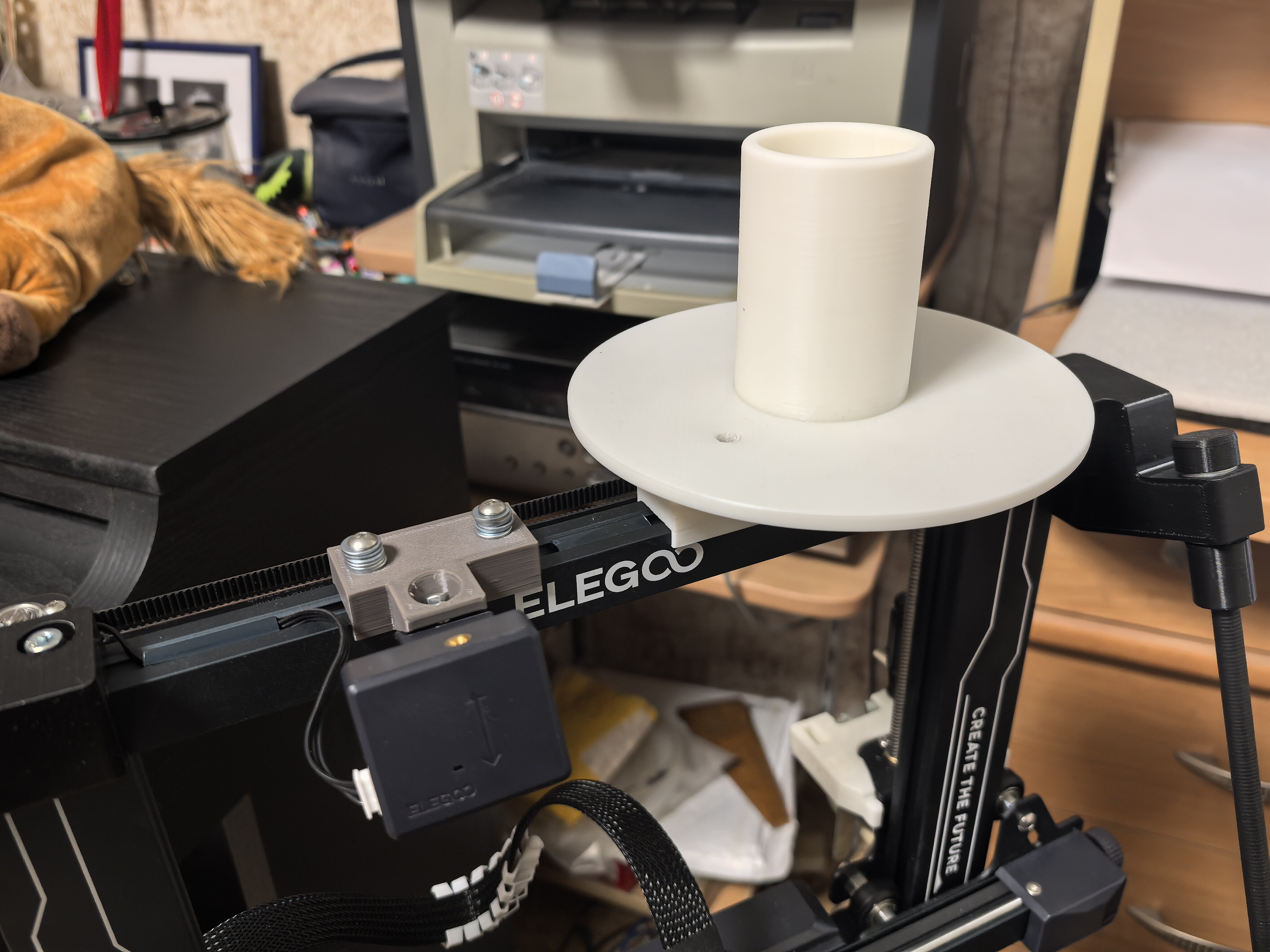 На место кронштейна встал швеллер с упорным подшипником на нем. Сверху на подшипник круглая опора под катушку и втулка диаметром 50 мм для посадки катушки. Длина втулки немного больше ширины килограммовой катушки. Вся сборка смещена к правой стойке рамы, чтобы выход филамента был ближе к середине рамы, примерно как и раньше.