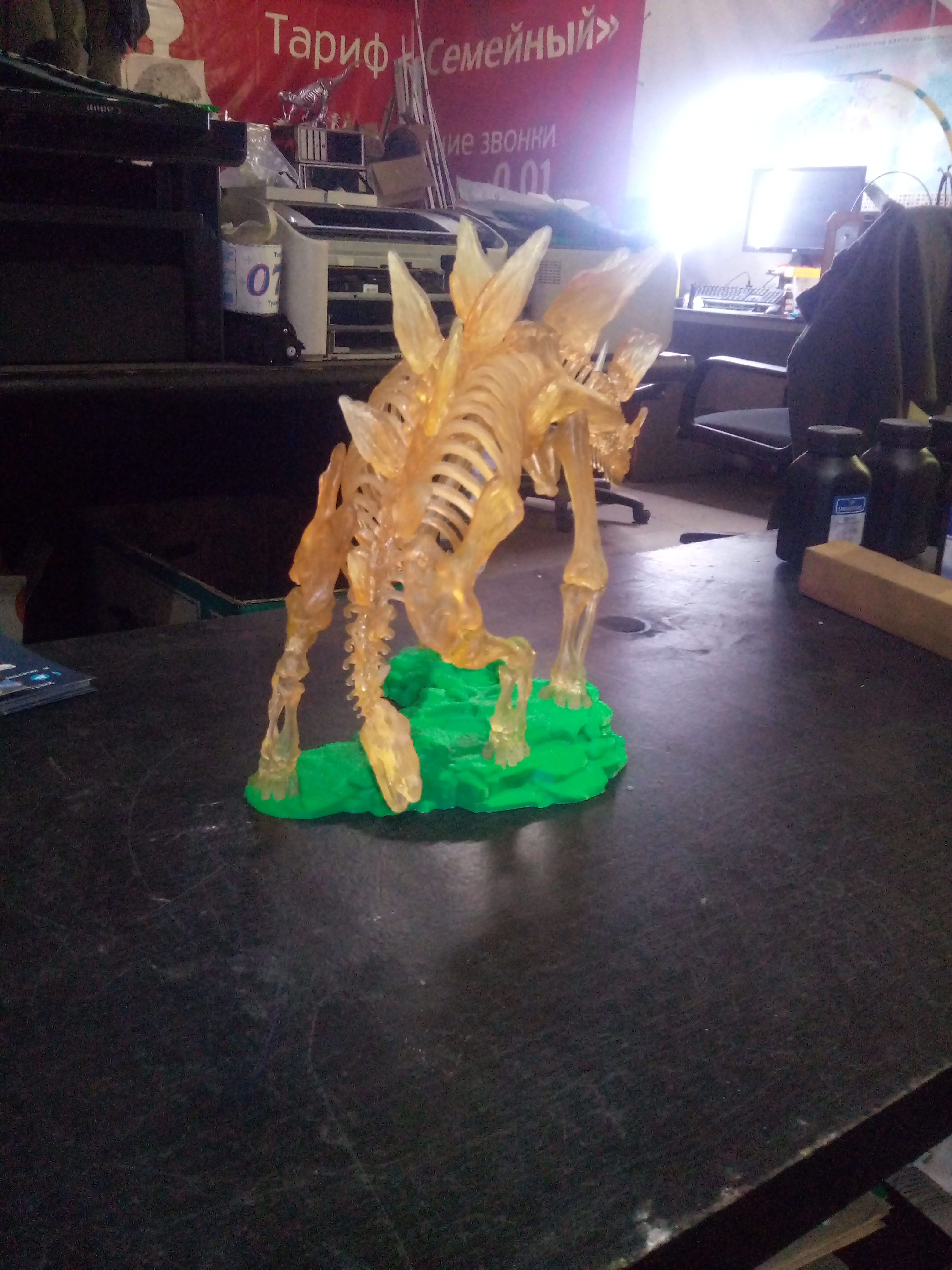 Помню, когда печатал его светящимся ABS сто раз проклял когда отпечатав хребет отделял поддержки, собирая не раз ломал ему рёбра а ставить всю конструкцию на ноги, та ещё история.