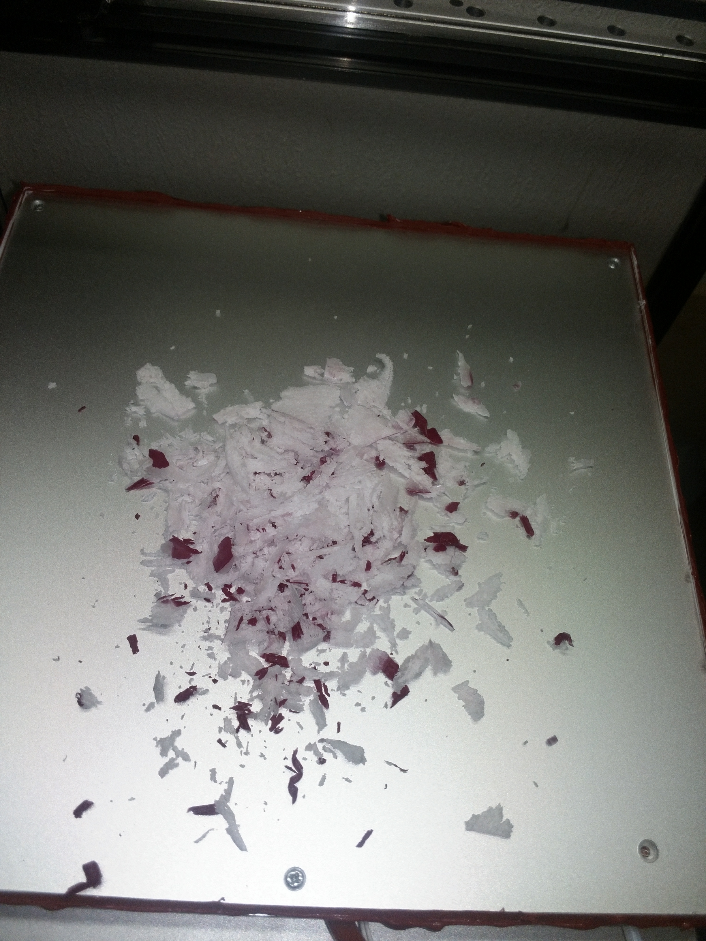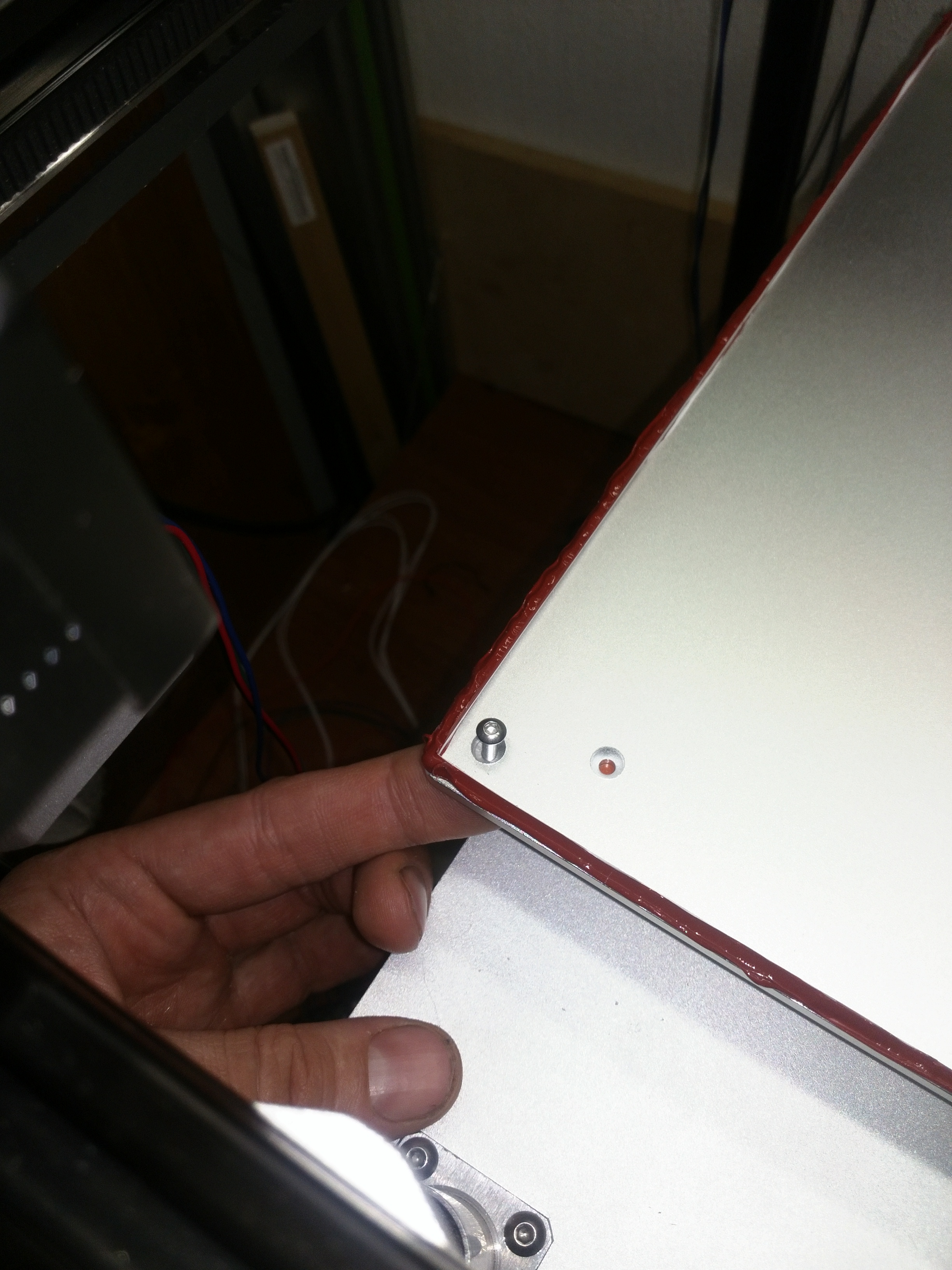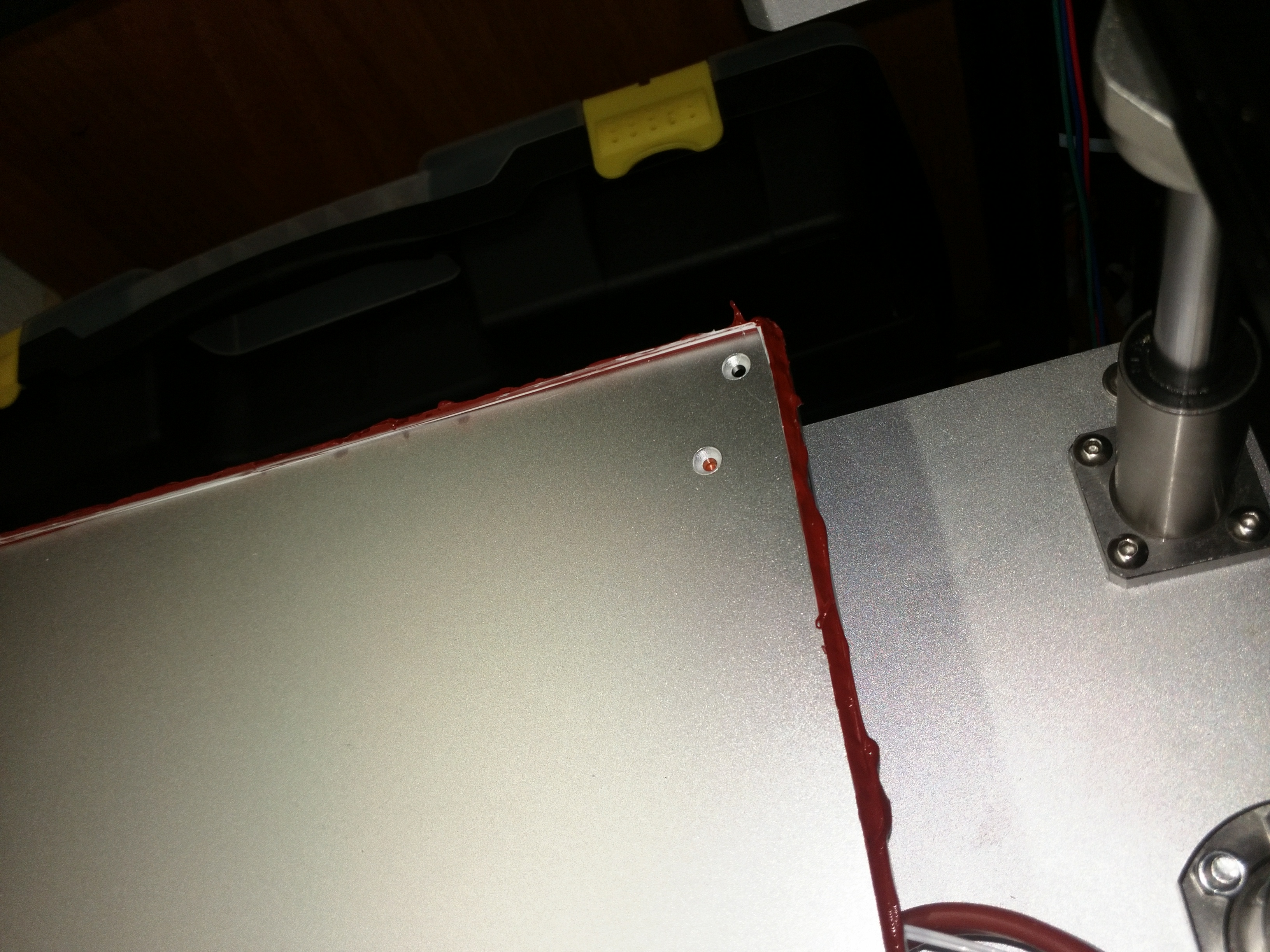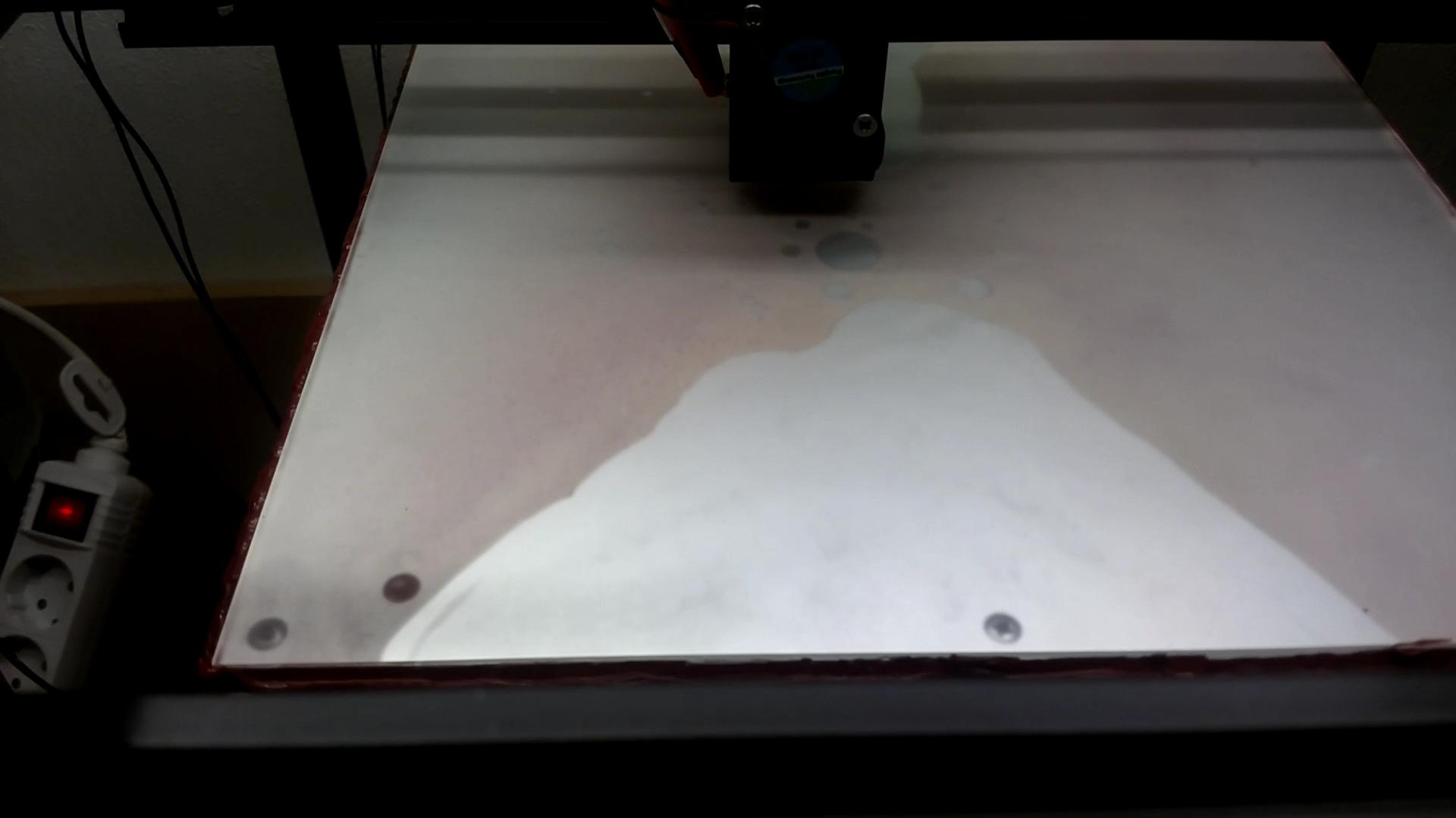 Для последующего извлечения стекла вставляем закладные винты.Крошим парафин, греем стол до 80 градусов и вставляем стекло.Есть немного пузырей и 2 большие области неровности мет. стола.