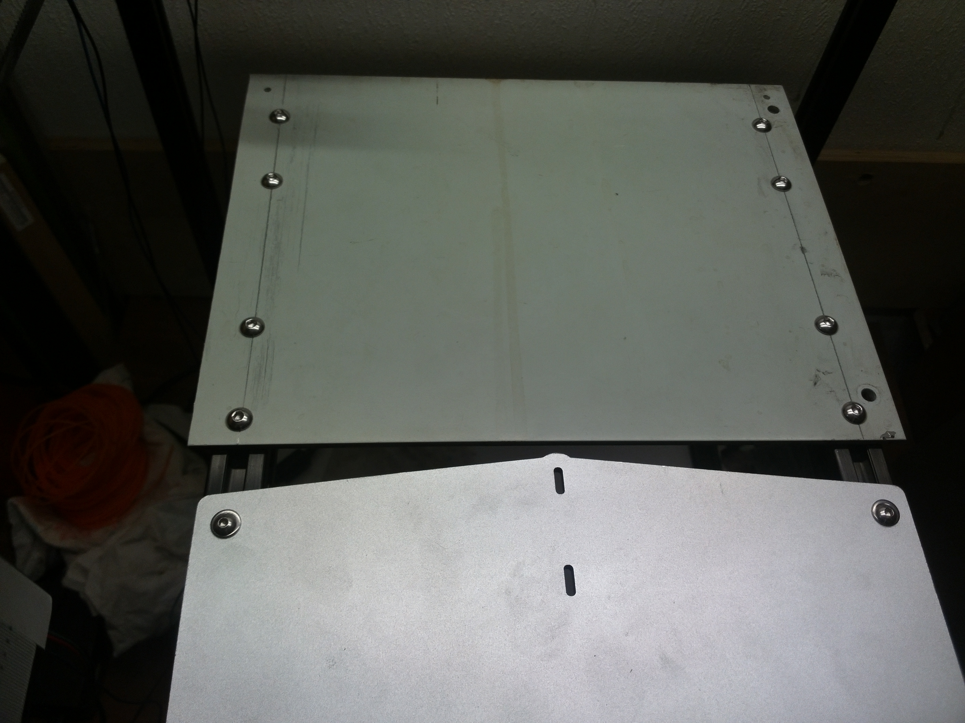 Решил усилить его пластиной, которая будет служить основой стола.Стол решил крепить жёстко, на винтовых стойках, а не пружинках, как традиционно предлагается.