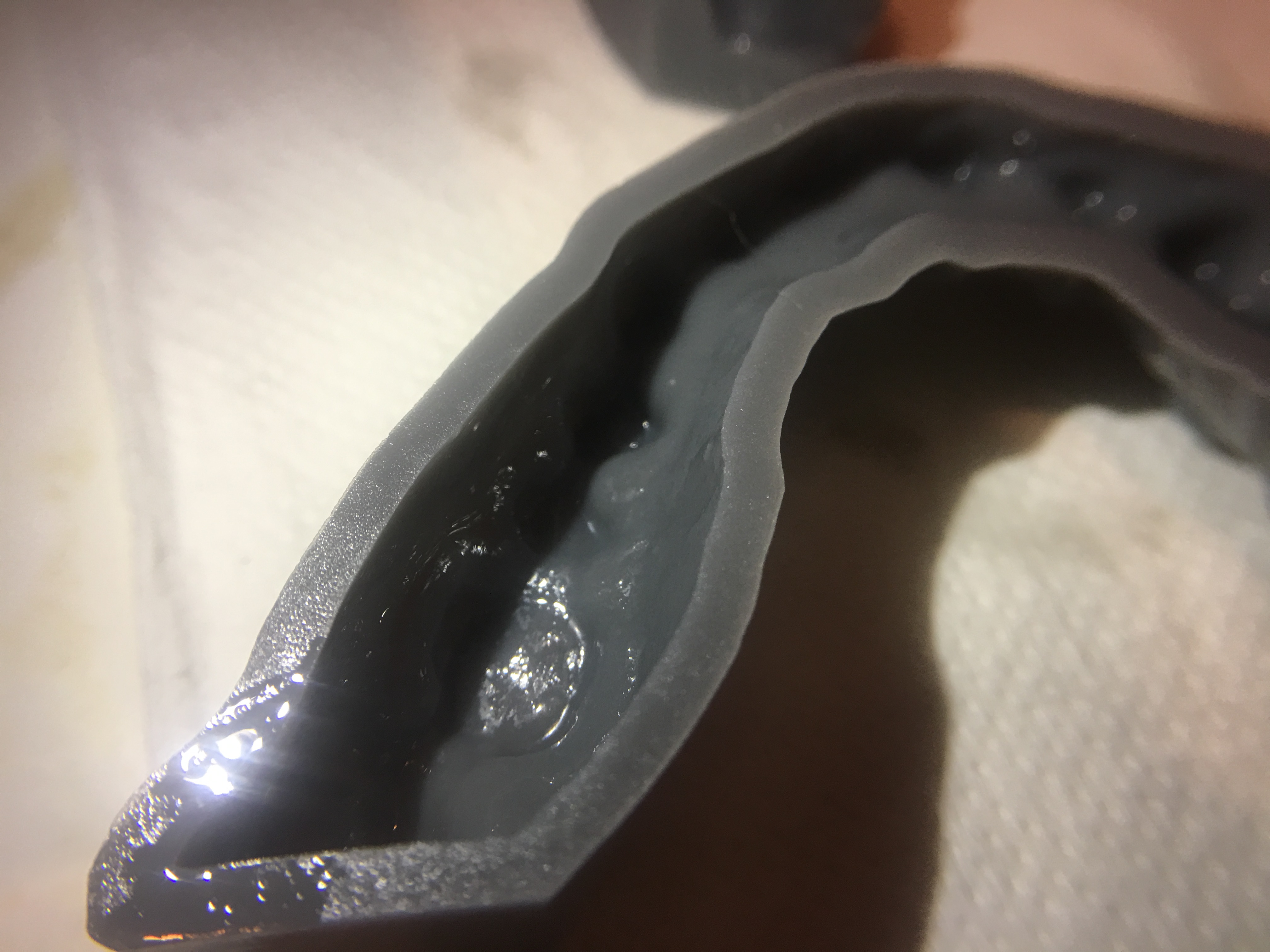 Ну и результаты печати... мягко говоря меня удивили. Где-то я слышал, что модели с форм2, напечатанные той же толщиной, что и на других принтерах, выглядят более гладкими, но я был уверен, что это просто рекламный трюк. Оказалось что нет, где-то в этом принтере спрятан маленький волшебник. Вот результат печати:На глаз рассмотреть слои крайне трудно. Модели в узв ещё не мыл, только ополоснул в спирте. Напоминаю, толщина слоя 100 мкм.