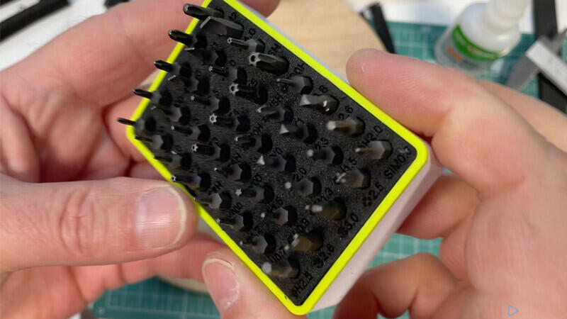 Отдельная тема — коробочка для бит. У меня этих бит — штук 150. Но этот комплект понравился особенно, решил сделать под него отдельный держатель. Магнитный, простой, компактный. Тоже будет в наборе.