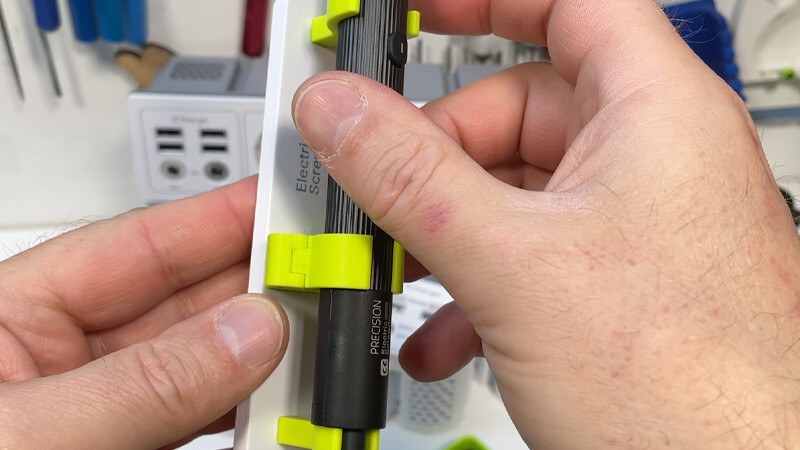 Конструкция состоит из базовой белой планки с магнитами. На ней установлены два направляющих держателя в виде буквы «Y» — они удерживают отвёртку в верхней части, просто позиционируют. Основная фиксация — в нижней части, где стоит автоматическая защёлка-клипса. Работает она по принципу флип-флоп: тянешь — открывается, вставляешь — защёлкивается. Всё одной рукой, без усилий.