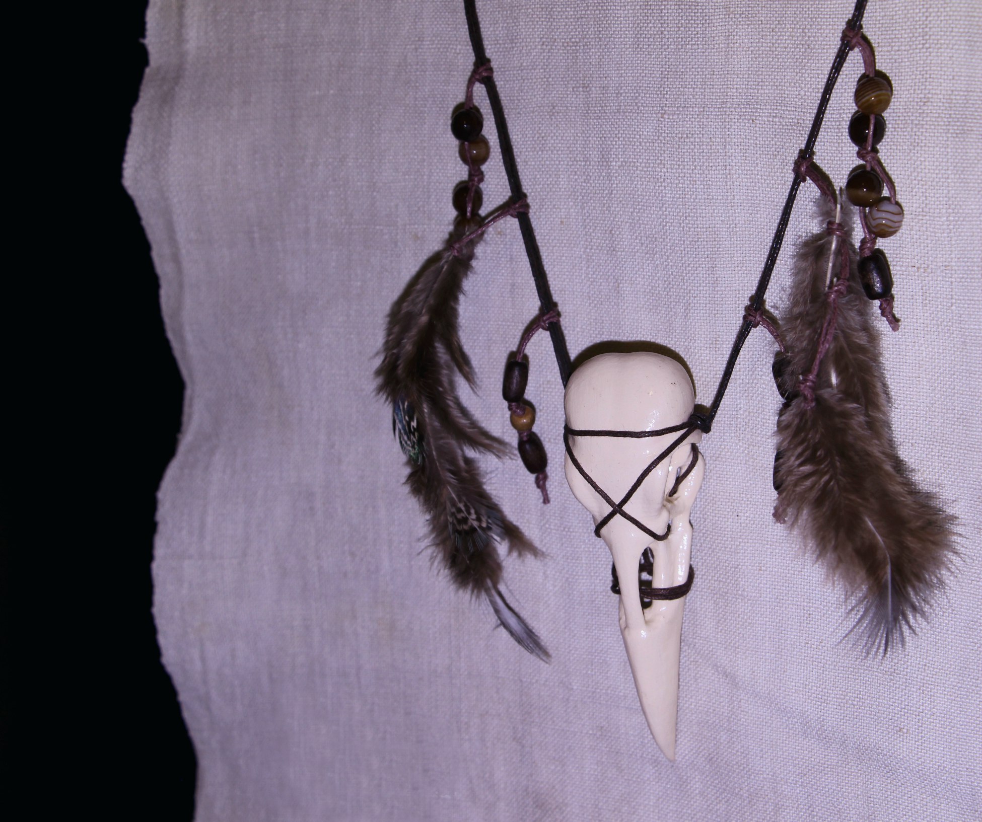 Череп был отшкурен и обработан кистью с ацетоном в несколько слоёв до полностью гладкого состояния. А остальное отдал на откуп девушке. Она достаточно талантливый человек, а 9 лет ДПИ от звонка до звонка позволили ей сотворить такую красоту в индейском стиле:Название ожерелью дала одна моя хорошая подруга, которая также занимается украшениями. А идея подобного ожерелья понравилась многим рукодельницам, поэтому скоро пришлось изготавливать несколько черепов различных размеров:По изготовлению могу сказать, что были использованы натуральные перья, вощёные шнурочки, а также бусины из дерева и агата. Для регулировки длины также в задней части было сделано плетение цепочки из квадратных узлов по технике макраме, что позволило скользить шнуркам друг относительно друга.