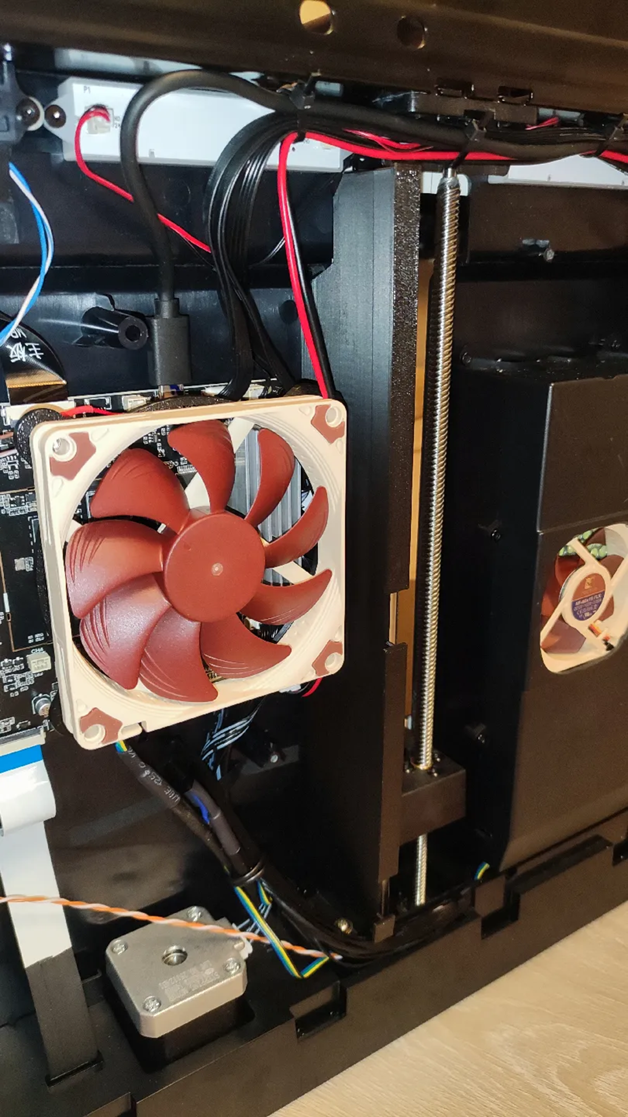 Отмечу также, что при использовании колпака и при длительной печати отсек с платой без установки дополнительного охлаждения довольно ощутимо прогревается, драйвера моторов греются до ~90 градусов. Это вполне допустимый температурный режим работы, но можно дополнительно установить вентилятор охлаждения платы с драйверами и перегородку, изолирующую отсек с платой от основного печатного объема: