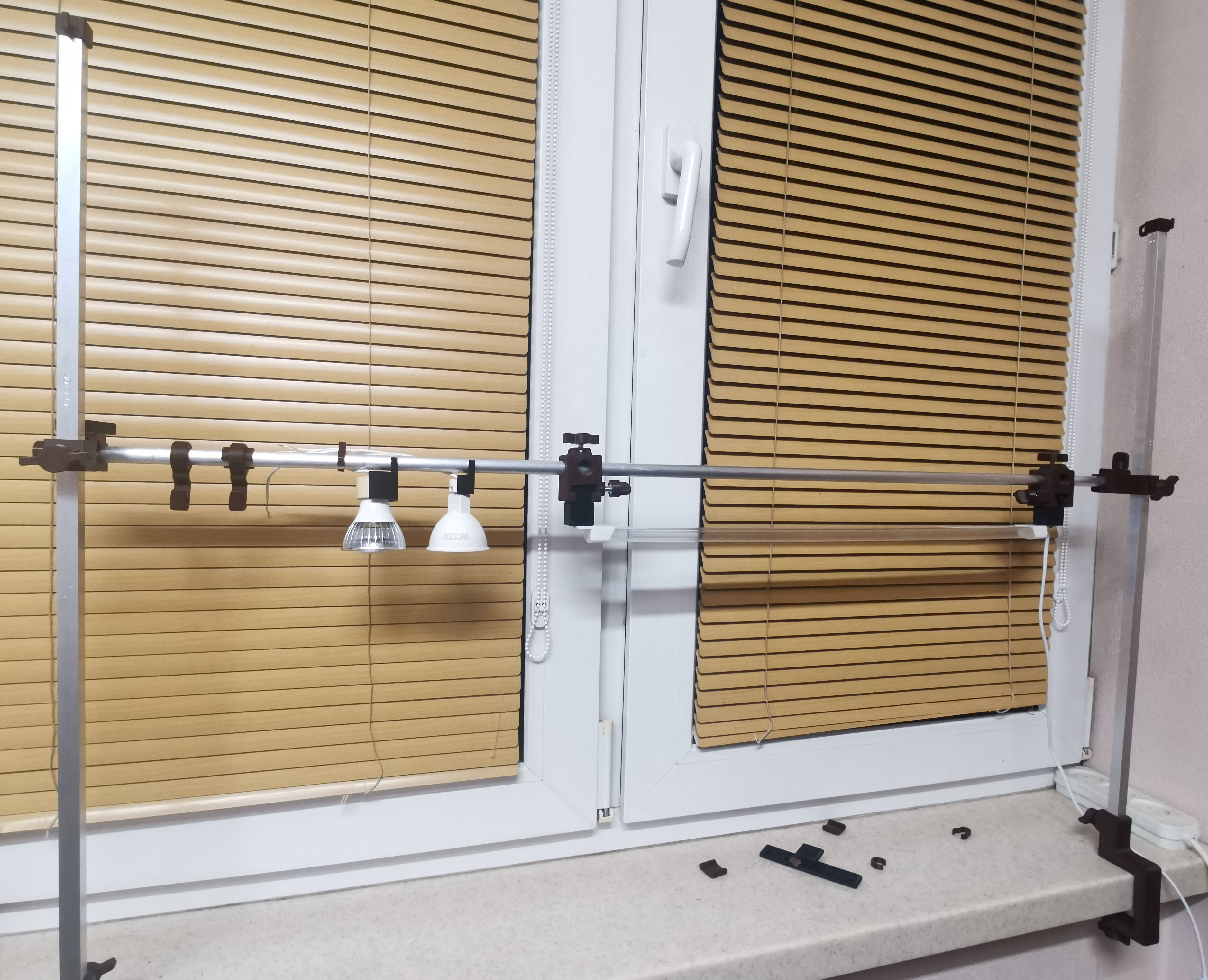 Моя жена уже много лет занимается выращиванием рассады томатов и перцев на подоконнике. Каждый сезон возникает задача организовать подсветку для растений на длинном подоконнике. За последние десять лет мы перепробовали несколько вариантов креплений и самих светильников. Некоторые конструкции оказывались неудобными в регулировке, другие — недостаточно жесткими, третьи требовали инструмента для изменения высоты подвеса. В целом проблемы был две: или нестабильность или жена не могла все это сама поставить и настроить.
