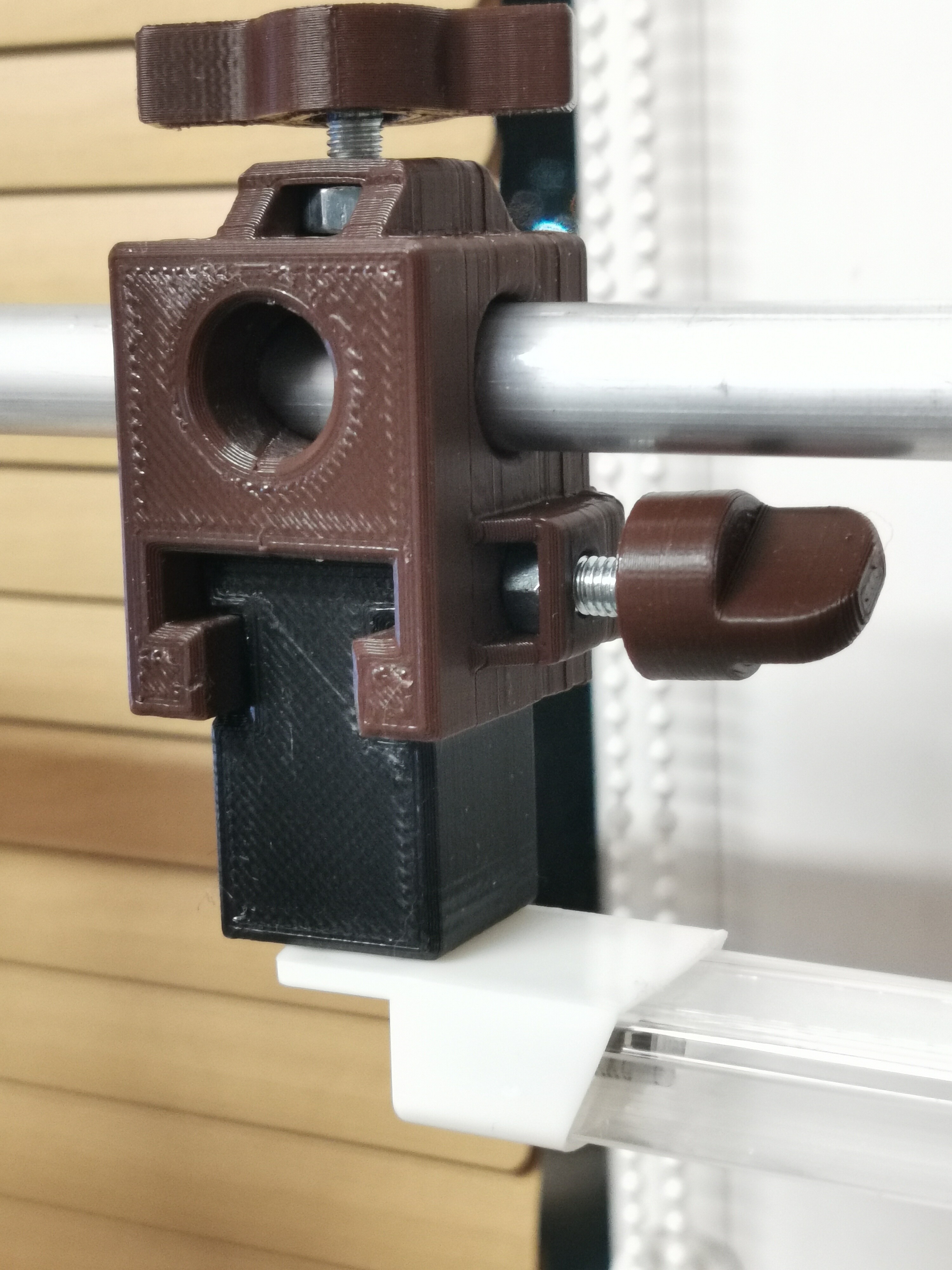 Для горизонтальной направляющей был выбран именно круглый профиль, так как хотелось иметь возможно вращения вокруг ее оси, но только когда надо. Затяжка болтом останавливает вращение оснастки на трубе, но еще осталась проблема вращения трубы в держателях. Здесь был выбран другой подход, испытанный в другом проекте: подкладка небольшого сложенного вдвое кусочка наждачной бумаги на тканевой основе. Это настолько увеличивает трение между пластиком и металлом, что вращение требует очень большого усилия.