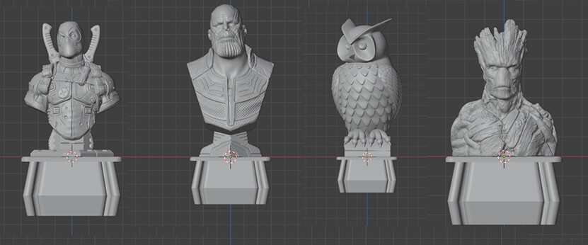 3. File→Import→Stl (.stl) выбираю сразу 3 файла: 1 - понравившуюся модель. Я выбрал Дэдпула, но подойдет любая фигурка в основании которой удастся сделать необходимую полость. 2 - (Osnovanie60x60) основание заглушки чтобы по ней масштабировать фигурку. 3 - (boolean) модель для создание полости в фигурке для дальнейшей закладки гайки и вкручивания болта.