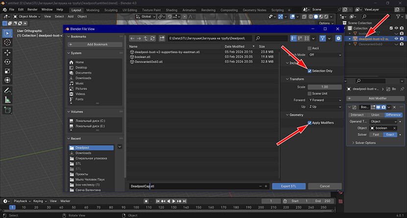 9. Теперь можно сохранить полученную фигурку: File→Export→Stl (stl.). Обратите внимание что стоят галочки в окнах Selection only и Apply Modifiers, а так же в списке моделей сцены выбрана только модель готовой фигурки.
