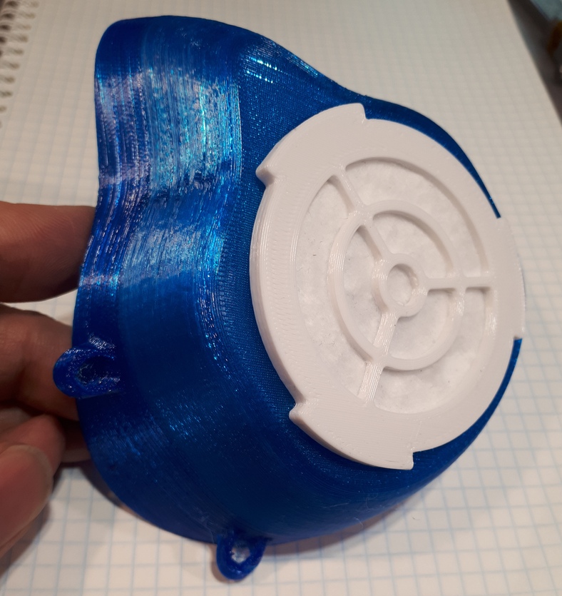 "Ладно, будем бездумно тратить дорогой пластик", подумал я и напечатал из флекса всю маску. Маска получилась ничего себе так. Другое дело, что "пятачок", на который надевается заглушка с фильтром, изгибался и пропускал воздух.