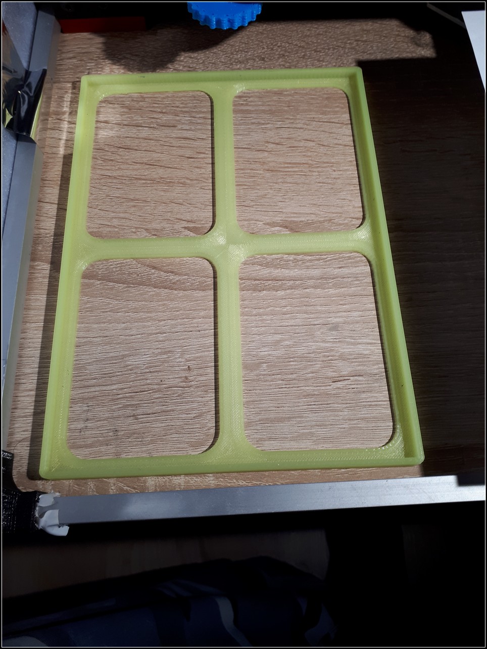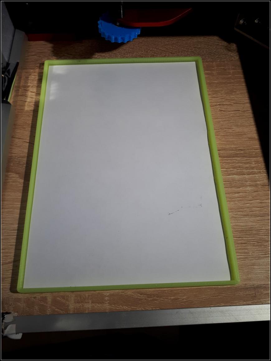 Надоело смотреть, как "карманы" возле стола принтера превращаются в аналог лесных полянок. Мусор, в основном состоящий из небрежно смахнутых со стола крошек, остатков "юбок" и "каймы" и прочих полосок пластика, уверенно заполнял всё свободное пространство кожуха. Старая кювета для фотопечати проблему не решила, так как была слишком велика. Тогда я замоделил свою кювету, поменьше. Но, предполагаемое время печати ввергло в кататонический ступор. Решение проблемы родилось в виде пустотелой рамки, размером аккурат в пол-листа А4. Что бы его согнуть, разорвать и положить. Модель -тут. Собственно, всё.