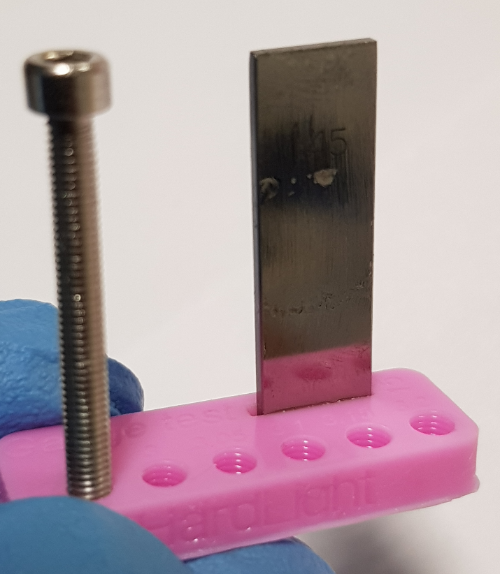 Быстрый тест показал, что отвердевший полимер обладает глянцевой поверхностью, а наличие белого красителя, как многим известно, увеличивает паразитную засветку. После этих мыслей мне захотелось проверить полимер на заплывание. Но хотелось измерить это на уровне припусков, чтобы понять возможно ли данным полимером печатать детали, требующие точности. И к счастью я приобрел концевые меры длины (набор №1) ;)Я чаще занимаюсь инженерными задачами при фотополимерной печати, из-за этого захотелось максимально точно узнать, какие припуски понадобится закладывать в модель. Концевые меры длины позволят мне установить точность печати до 10 микрон.