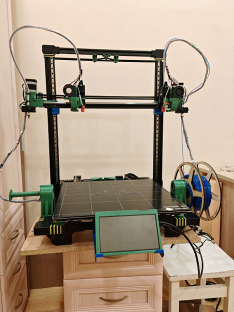 За этот месяц я сделал основные вещи и уже могу печатать на принтере, одним соплом без проблем. Тем не менее, остается решить некоторые вопросы, самый сложный из них это как исправить кривизну стола, чтобы печатать сразу двумя головками. Кроме того, надо разобраться с датчиками филамента. А еще и с акселерометром, который тоже не может найти хост (судя по описанию из интернета, тоже брак). Разместить электронику в корпусе, хочется взять под это какой-нибудь железный ящик, а не печатать самому, чтобы в случае чего, корпус не загорелся. Ну и хочется сделать макрос на смену инструмента как на Востоке, чтобы уходило не 6 секунд, а хотя бы 1 на смену инструмента. Но это уже понятные задачи, из-за решения которых, не хотелось откладывать публикацию. Если кого-то заинтересуют модели или конфиг, то могу поделиться. А так, продолжение следует…