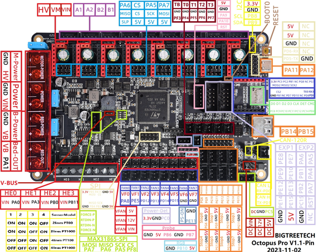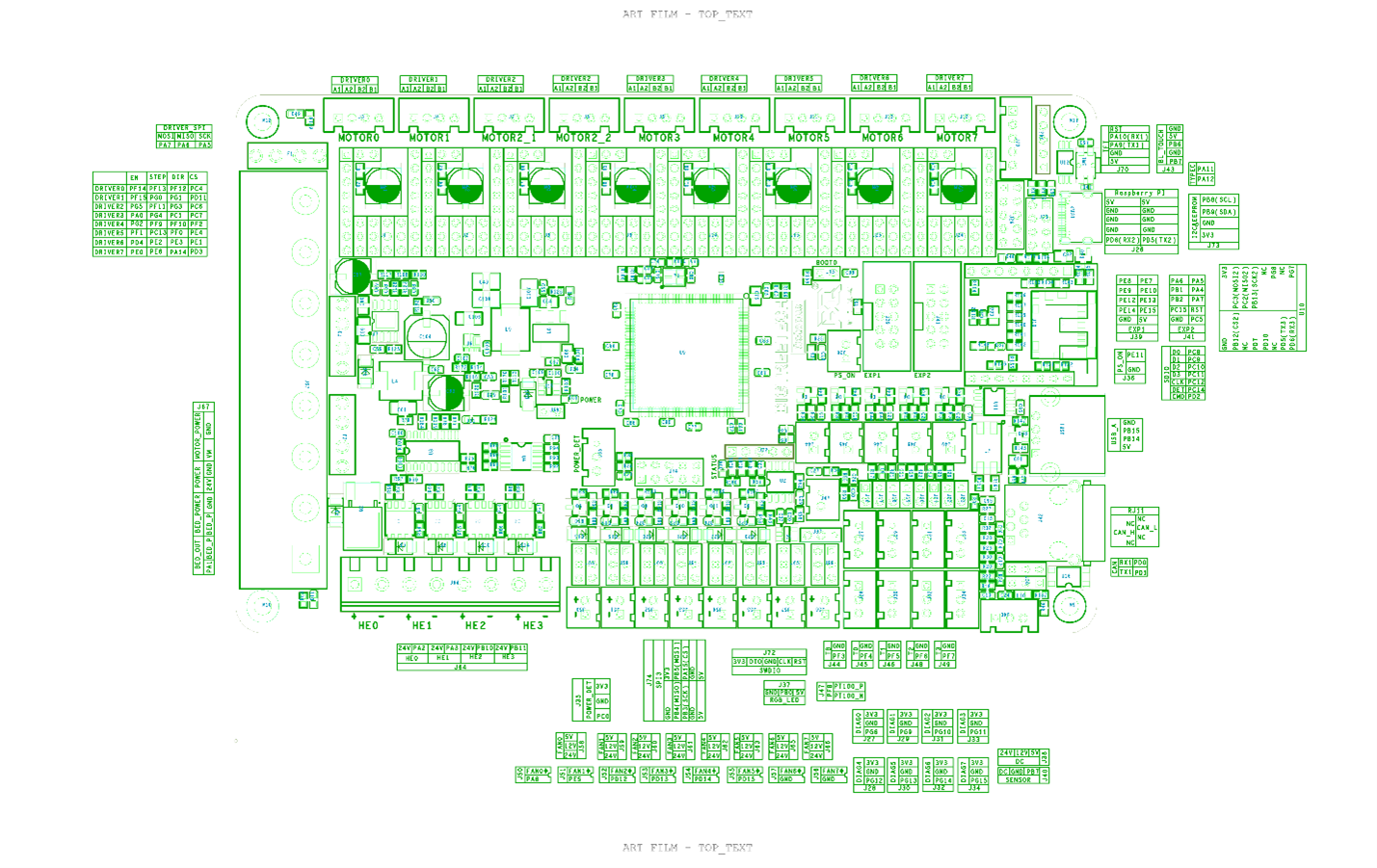 Так как существует две распиновки, то не повторяйте моих ошибок – используйте референс от производителя, который размещен на гитхабе. Первая версия прошивки, которую я собрал, используя пинаут имела интересную особенность. Сразу после включения начинало греться сопло Е0, а нагреватель 115 Вт, так что я быстро заметил, что что-то идет не так, как силиконовый носок начал обгорать (это нормально для новых носков). Я отключил питание платы и начал изучать вопрос. Оказалось, всё дело в том, что на схеме с зелёной распиновкой перепутаны пины нагревателя и пин с мотора М0 в моей конфигурации при включении открывает ключ нагревателя на полную катушку. Эту проблему исправил, принтер теперь не устраивает попытку самосожжения, теперь можно откалибровать PID сопел. Затем я попытался включить стол, который запитывается от штатного силового ключа Chiron, так как стол на 400 Вт, а плата может через себя пропускать только столы на 300 Вт, но он также не хотел работать сразу (как и всё остальное). Несмотря на то, что питание стола проходит не через принтер, плата всё равно не даст сигнал на выход PA1 (или любой из выхода на экструдер, если переназначить), если на B-Power не будет приходить питание, так что от питания платы были установлены перемычки, чтобы можно было давать сигнал на ключ. После этого стол стал работать и был установлен в режим watermark, так как нет смысла на нем использовать PID.
