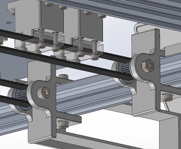 Также, как и по остальным осям, стол передвигается на рельсах MGN9, только на двух, на каждой из которых по две каретки. На штатной подставке стола были дополнительно сделаны отверстия для крепления кареток, а также для крепления двух ремней GT2 шириной 10 мм, так как на ось Y я решил поставить второй мотор, аналогичный заводскому, чтобы принтер мог быстрее печатать без пропусков шагов. Ремни крепятся с помощью специальных прижимов, которые повторяют форму ремня. Натяжитель пока что был сделан в виде опоры, которую можно прижать руками (за счёт специальных выступов) к раме, а затем затянуть винты. В дальнейшем планируется спроектировать более изящное решение с гайкой, вращая которую, можно натягивать или ослаблять натяжение ремня: