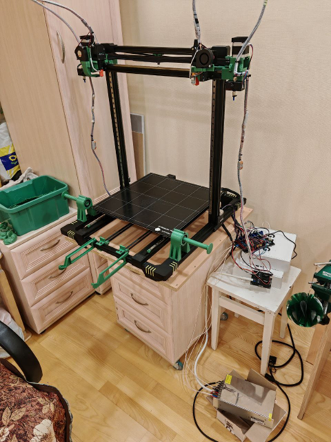 После этого я решил проверить работу вентиляторов, они на удивление, управлялись штатно. В отличие от моторов. Беды пошли сразу и с оси X. Почему-то игнорировалось существование первой головки и парковалась сразу вторая, а затем при ручном управлении управлялась первая. Я долго бился над этим ребусом, пока не посмотрел статусы концевиков (используется sensorless homing). На первой каретке он оказался всегда включен, всё снова из-за неправильной распиновки с зелёной картинки (на поиск ошибки ушло около нескольких часов). Затем после этого уже было проще отладить ось Y и Z и спустя несколько часов я впервые смог осуществить парковку на принтере. После этого я полностью просмотрел config reference Klipper и уже самостоятельно настроил прошивку так, как мне нужно за вечер. Далее, перед первой печатью были откалиброваны шаги экструдера, а также выяснилось, что датчик окончания филамента не работает. Даже не так, оба не работают. Пластик внутри есть, а лампочка горит красным. Разборка показала, что физически концевик работает. Судя по информации с форумов, мне попались два бракованных концевика, так что их я пока что закомментировал в прошивке, досадно, они ведь по тысяче каждый стоили. После тестовой печати первого кубика были настроены LA и откаты. Затем я решил настроить input shaping и хорошо, что это был день, так как, внезапно, стол массой под 2 кг при ускорениях 10000 мм/с2 сильно раскачивает и сам принтер, и тумбочку, на которой он стоит, от чего стоит сильный грохот. Тем не менее, установка рельс и двух моторов дала свои плоды, рябь меньше всего видна на 3000 мм/с2 по оси стола. По оси каретки меньше всего ряби на 8000 мм/с2. Но пока я не сделаю мягкие ножки для принтера, я больше 2000 мм/с2 печатать не буду, чтобы тумбочка не стучала, а в след за ней и соседи на меня. Ссылка на видео, где видно как всё трясется и гремит на ускорениях 10000 мм/с2 на столе https://vk.com/video74173104_456240107?list=ln-fm2thJVvajqkBm0Tg7
