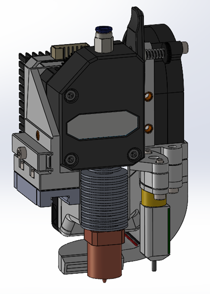 Представляю вашему вниманию IDEX на базе Anycubic Chiron (вторую голову лучше представлять виртуально, так как всё остальное нормально зеркалировалось, а после отзеркаливания печатной головы, мне пришлось чинить модельку около получаса, так что я решил, что лучше пусть вторая голова будет воображаемая). Рассмотрим модель подробнее, печатная голова: