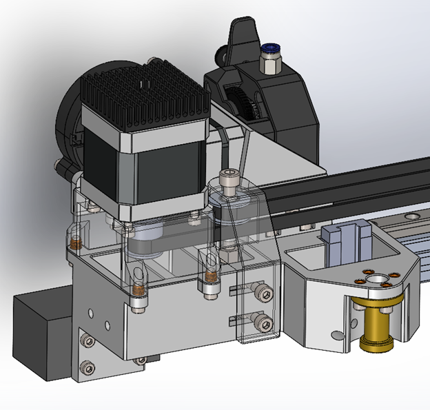Мотор крепится сверху, так как если его крепить снизу, то получится, что относительно плоскости печати детали балки рычаг действия сил на вал мотора будет больше. Натяжитель ремня находится «внутри», чтобы сократить длину используемого ремня. Натяжение осуществляется за счёт ослабления двух винтов и его ручного натяжения с последующей затяжкой этих винтов. С другой стороны, находятся гайки, которые двигаются в пазе. Родные ходовые гайки еще несколько лет назад были заменены на беззазорные. Также еще на балку с обеих сторон крепятся датчики окончания филамента BTT SFS V2.0. Также данные датчики играют роль второй опоры трубки для филамента.