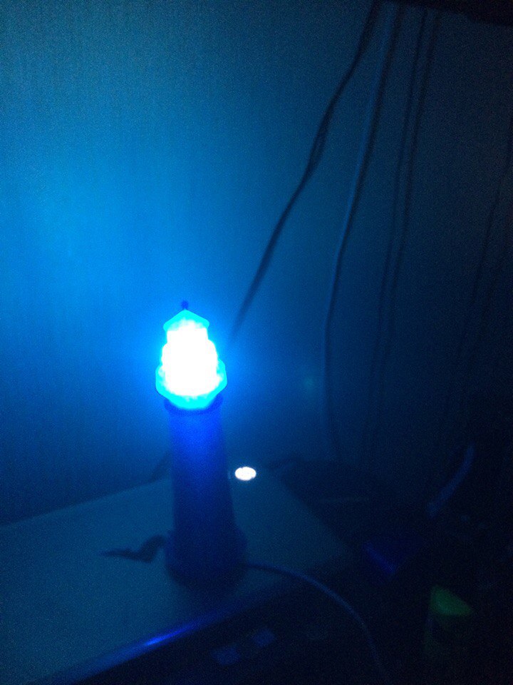 Буквально за час я справился с внешним каркасом и оставил внутри отверстие для электрики. Так как модель получилась большая(290мм в высоту), то пришлось разделить её на части. Печатал я части пластиком СБС ( так как другие уже закончились) по очереди : сначала основание, а потом остаток башни. Спустя 9 часов получилась довольно таки неплохая модель и можно было идти обрабатывать её сольвентом.Пока это дело сохло мы с девушкой пошли в хозяйственный за электрикой. И здесь опять таки на удивление все прошло без всяких проблем : нашли маленький патрон для светодиодной лампочки , саму лампочку на 3 вата и провод с вилкой и выключателем.Затем , прийдя домой, собрал и проверил работоспособность всей Электрики , начал моделировать для неё крепление к маяку. Здесь опять же все получилось быстро и просто : поставил патрон с лампочкой на круглую платформу , которая вставлялась во внутреннее отверстие маяка, и приклеил её к стенкам. Затем собрал обе части маяка и ещё раз обработал стыки склеивания и тд. Кстати, лучший эффект обработки достиг путём нанесения сольвента через пуливизатор.Итак ... Каркас склеян, электрика работает - все стоит на своих местах. Теперь настал момент включения... Как и положено для ночника , я включил его когда стемнело. Я был впечатлён его свечением и даже немного доволен нашей с девушкой работой. В общем делюсь с вами моделью и желаю всем добра.