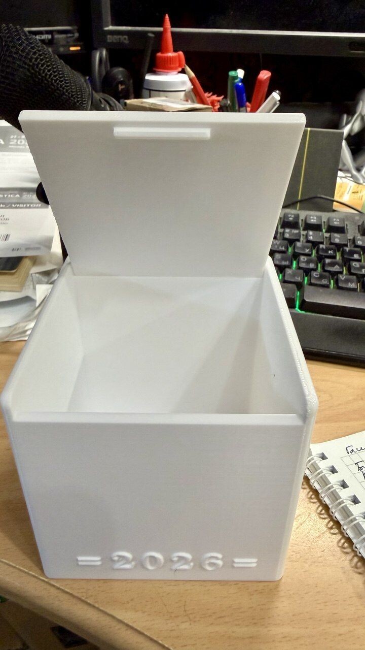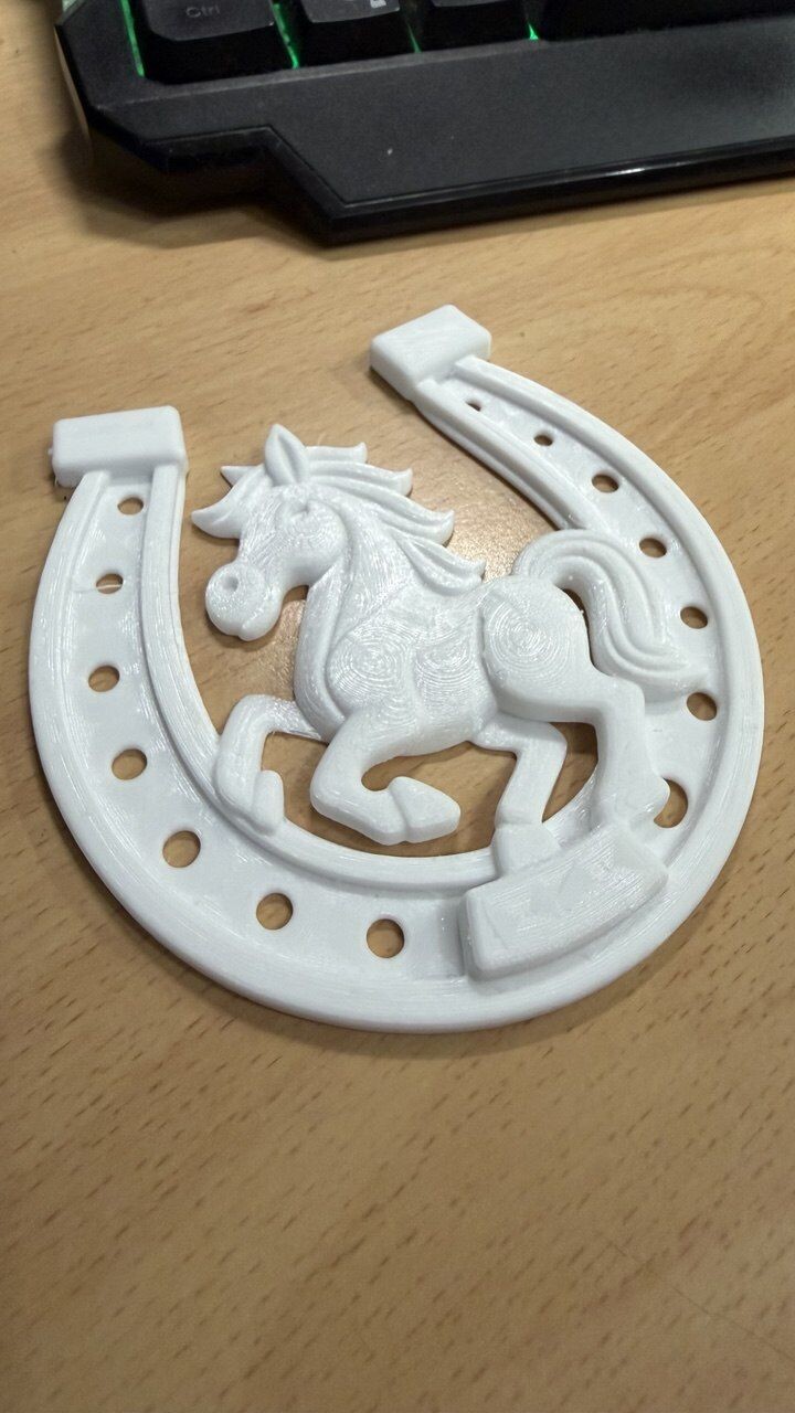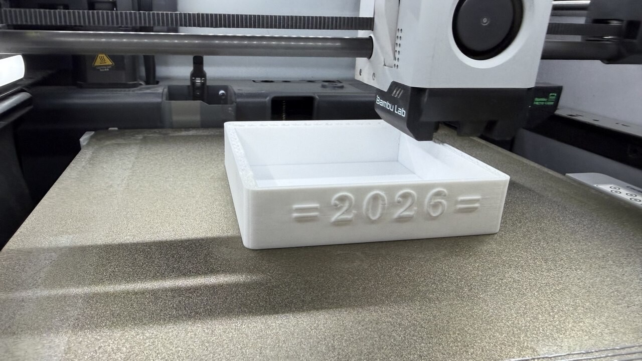 Я распечатал несколько прикладных вещей: короб-органайзер с наложенным в слайсере текстом «=2026=» и декоративную подкову, чтобы проверить мелкие элементы.