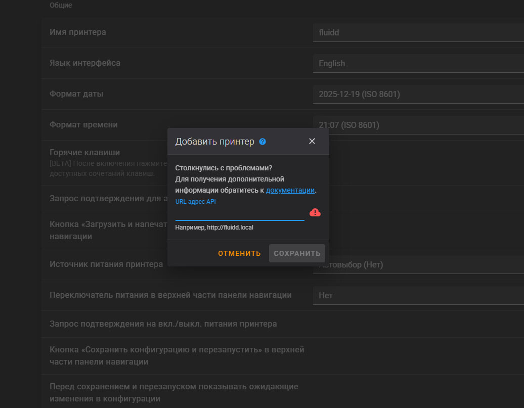 В это окно вводим адрес нашего принтера с приписанным портом Moonraker API (7125)