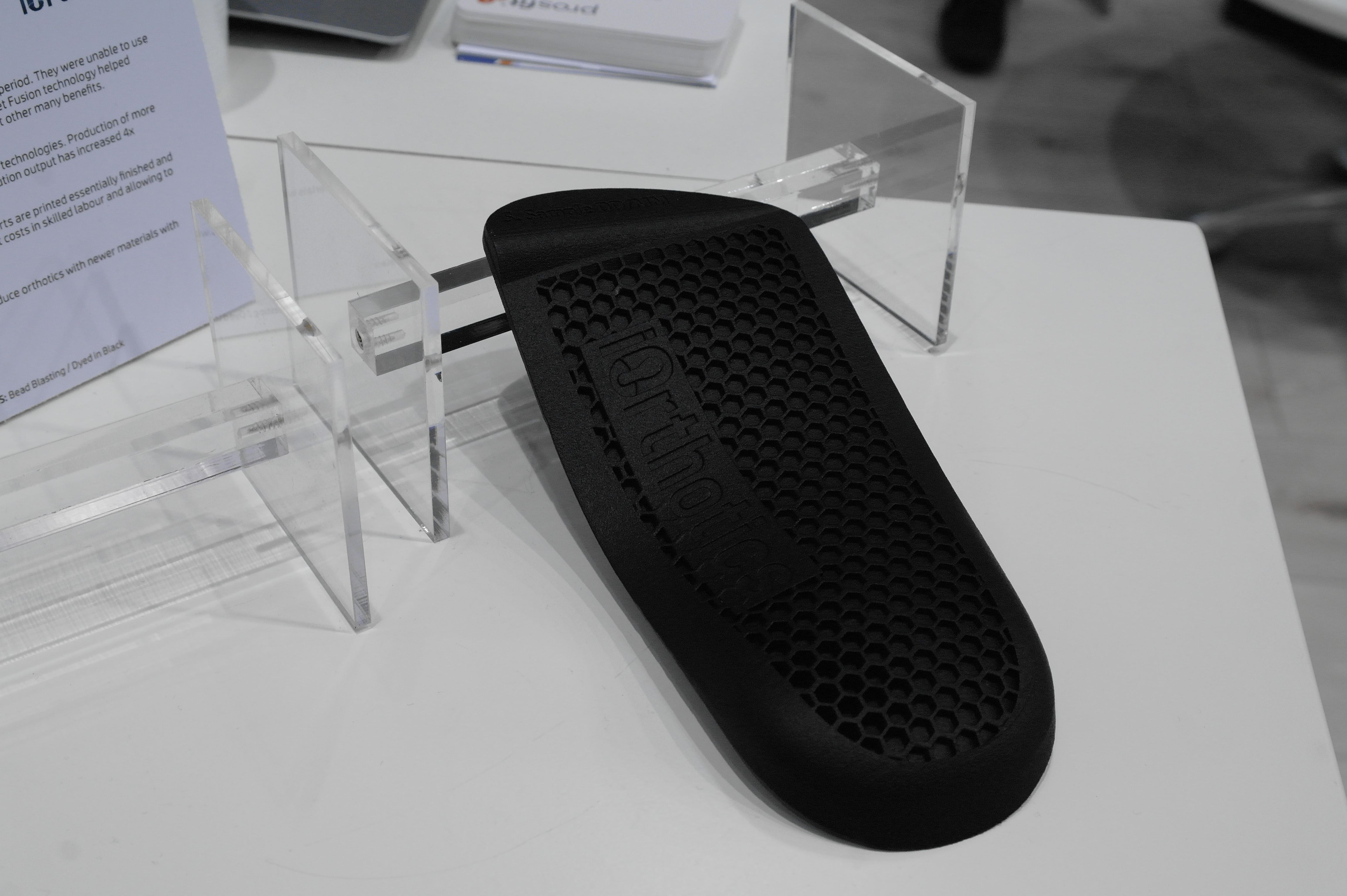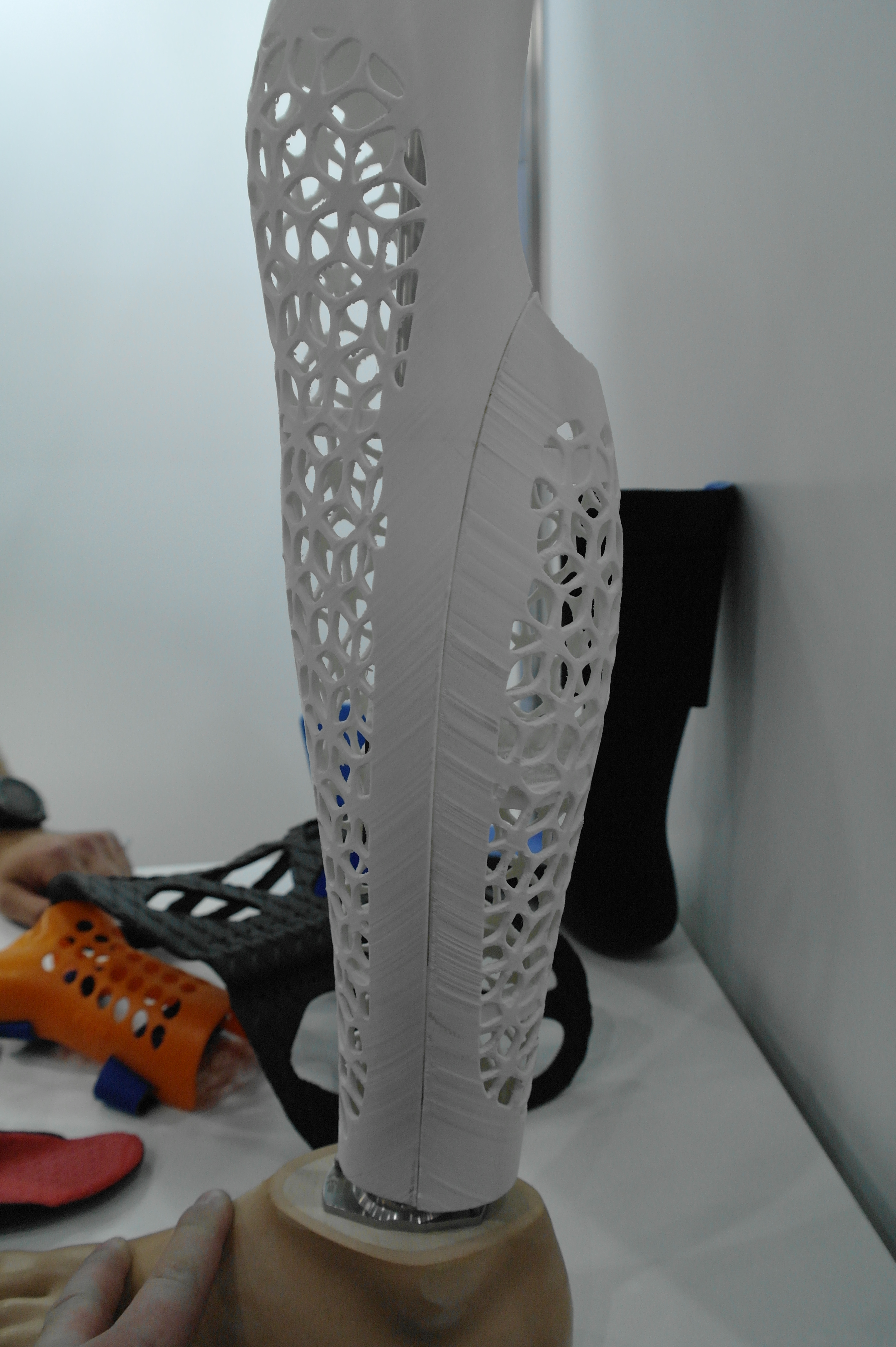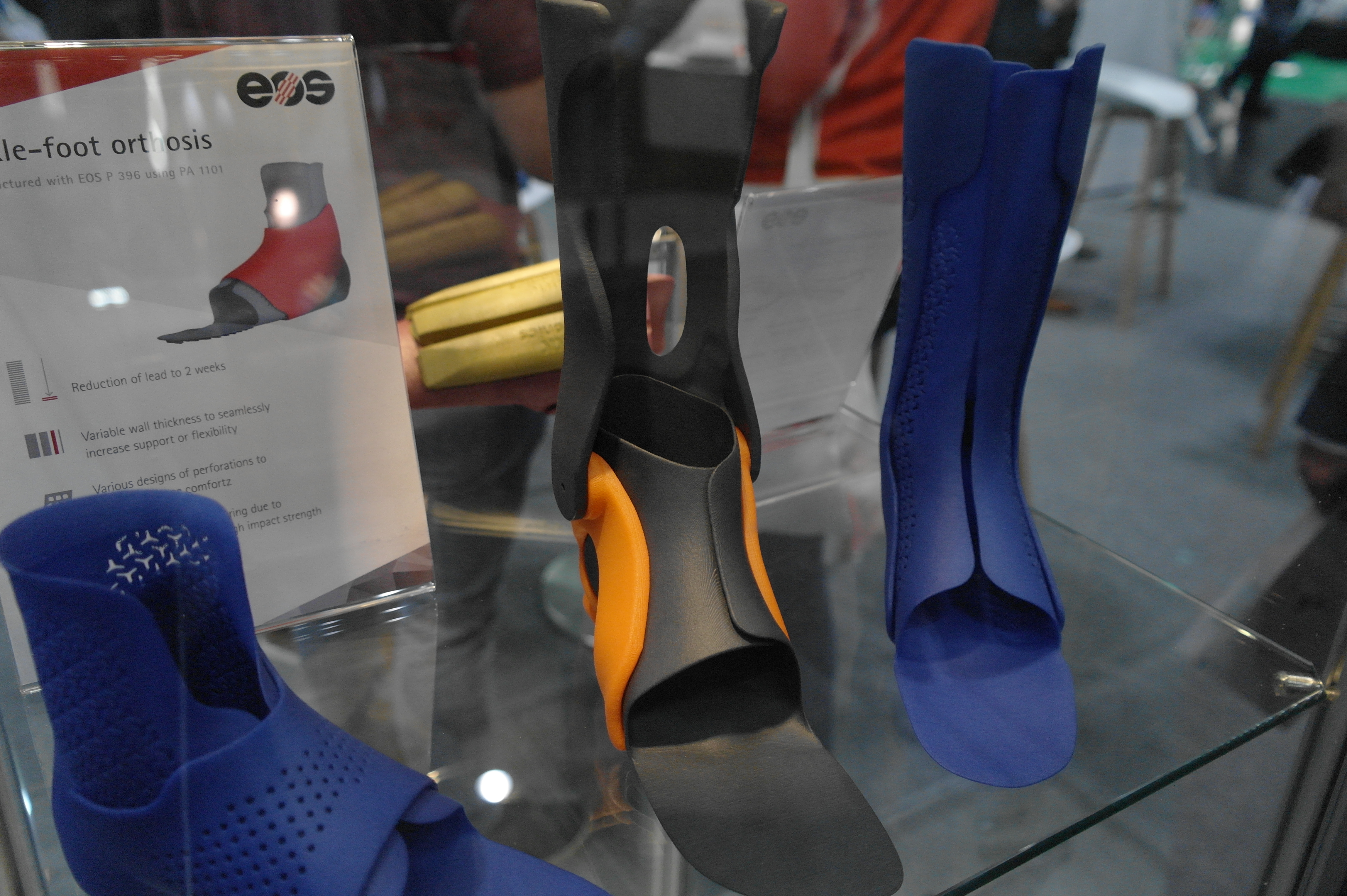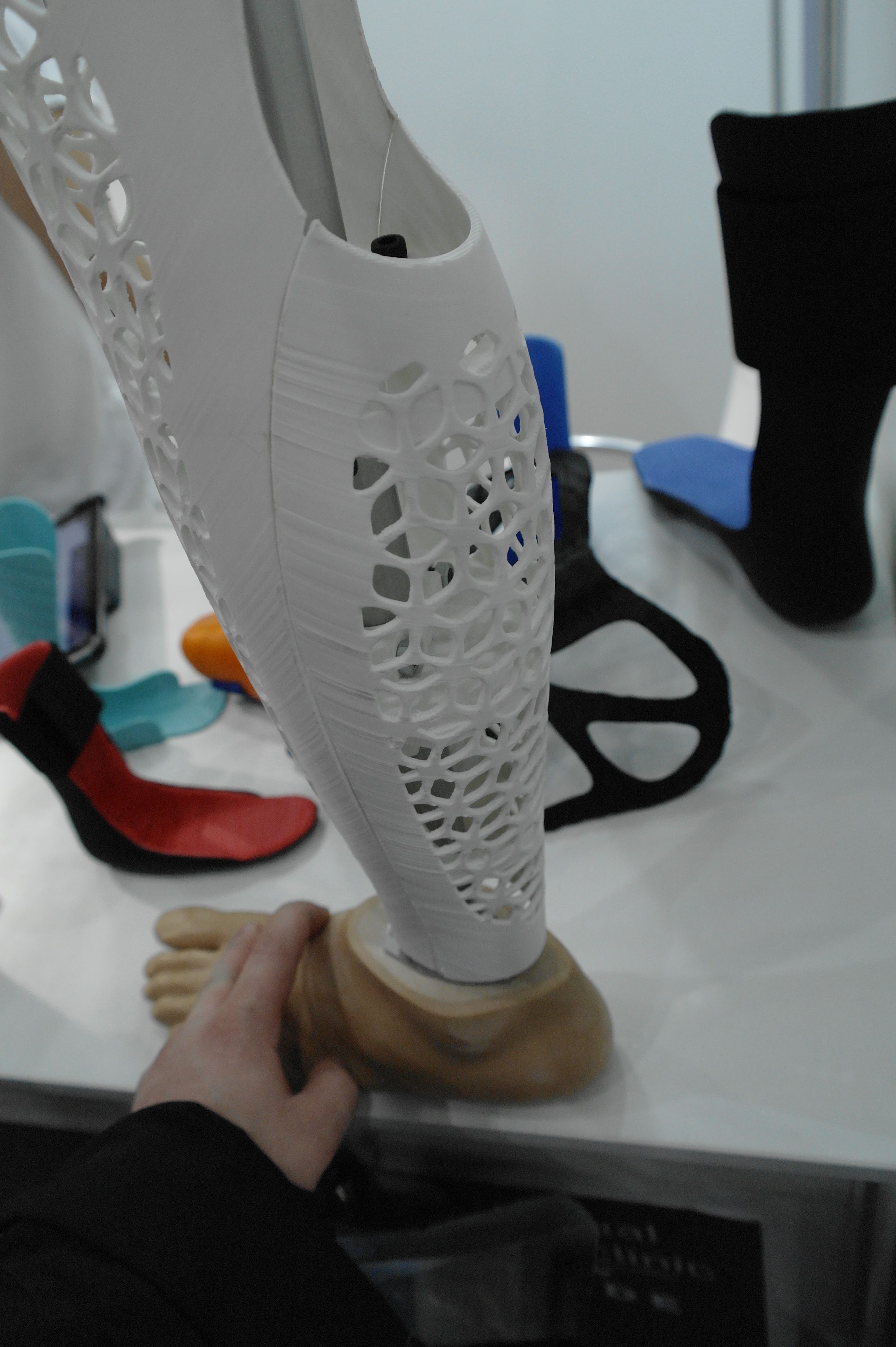 Помимо именитых фирм очень многие используют достаточно бюджетные принтеры для прототипирования ортезов или оснастки.Отдельным стендом выставлялись ребята из WASP.Помимо принтеров они представляли и свой сканер.Даже у самых известных компаний в отрасли, вроде Otto Bock можно было найти те же Raise. Я за всю выставку насчитал порядка 5 штук этих принтеров.Причем головы принтеров были оснащены фидерами от Bondtech. Ибо штатная голова на 2 экструдера весит порядка 900 грамм. Почти килограмм директа на 2 валах 8 мм диаметром. Апгрейд от Bondtech на дуал версию весит 425 грамм.Для изготовления стелек для ортопедической обуви используется скан стопы с последующей его печатью.Так же был обнаружен новенький двухголовый Leapfrog.Тут был недавно пост о печати косметики для протезов. Ее тоже печатают. Не всегда хорошо, но как объясняют, что для примерки отлично подходит, а конечный результат получают при помощи печати на SLS.Крепление всегда осуществляется за неподвижные элементы протеза.