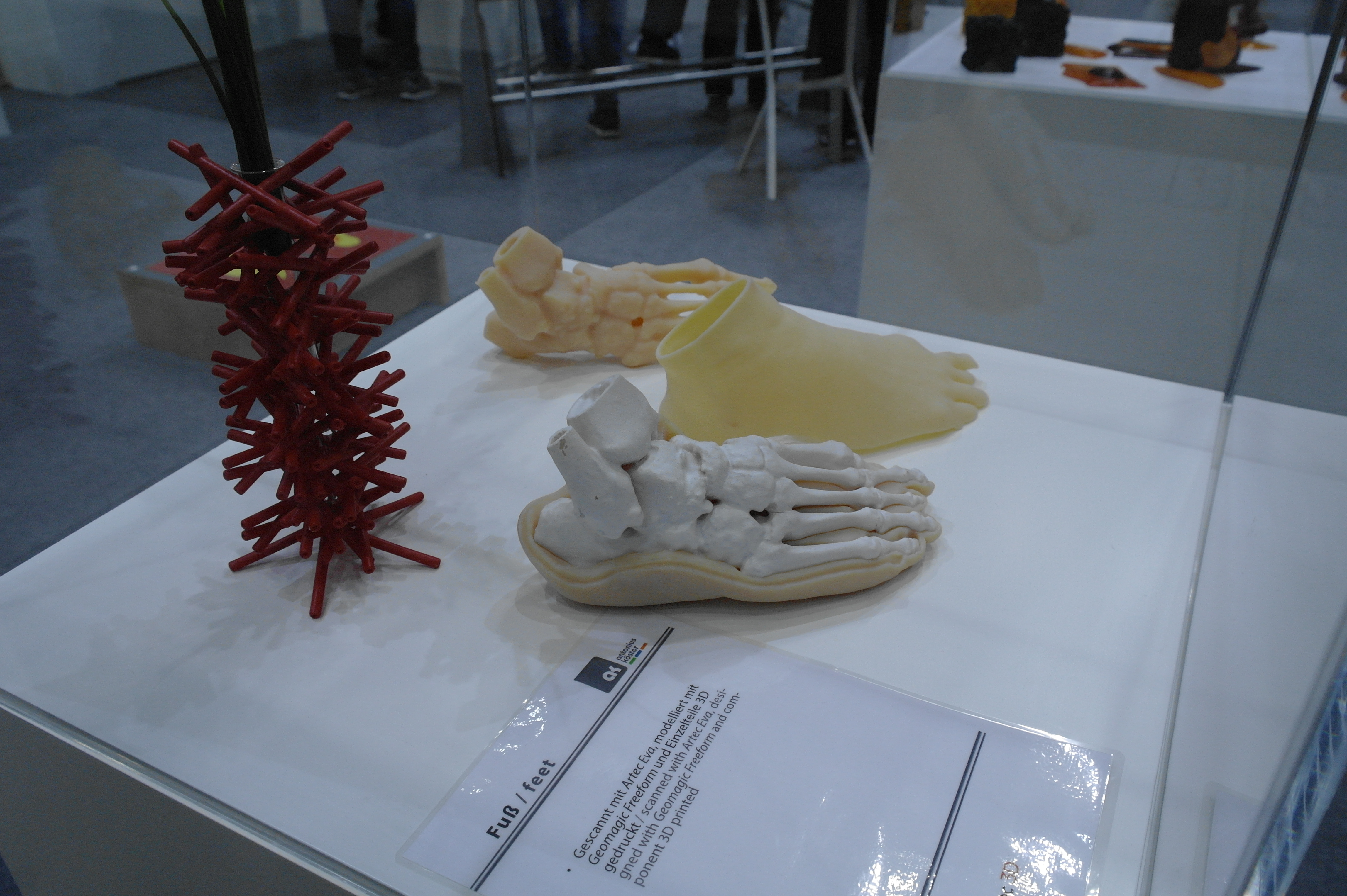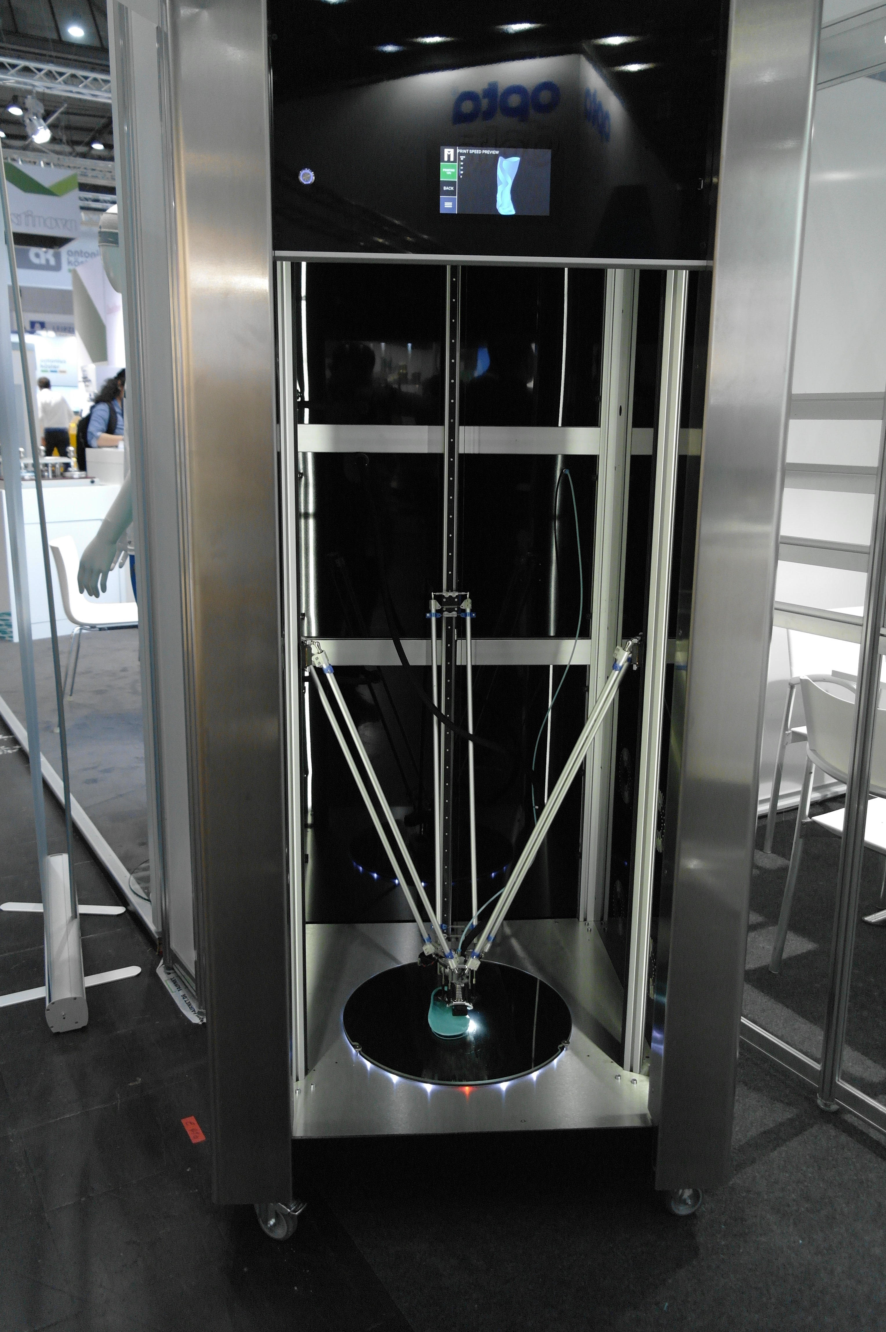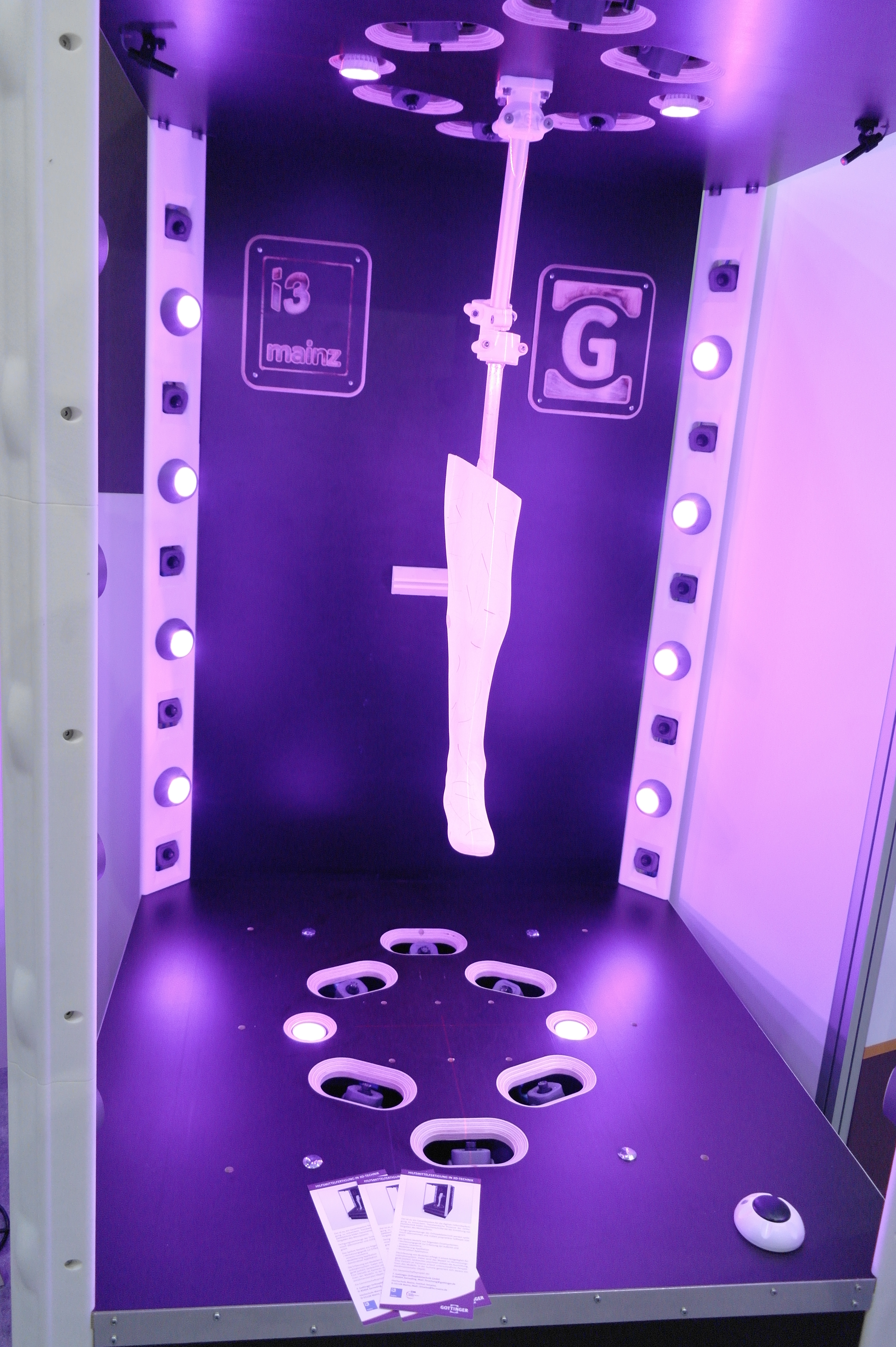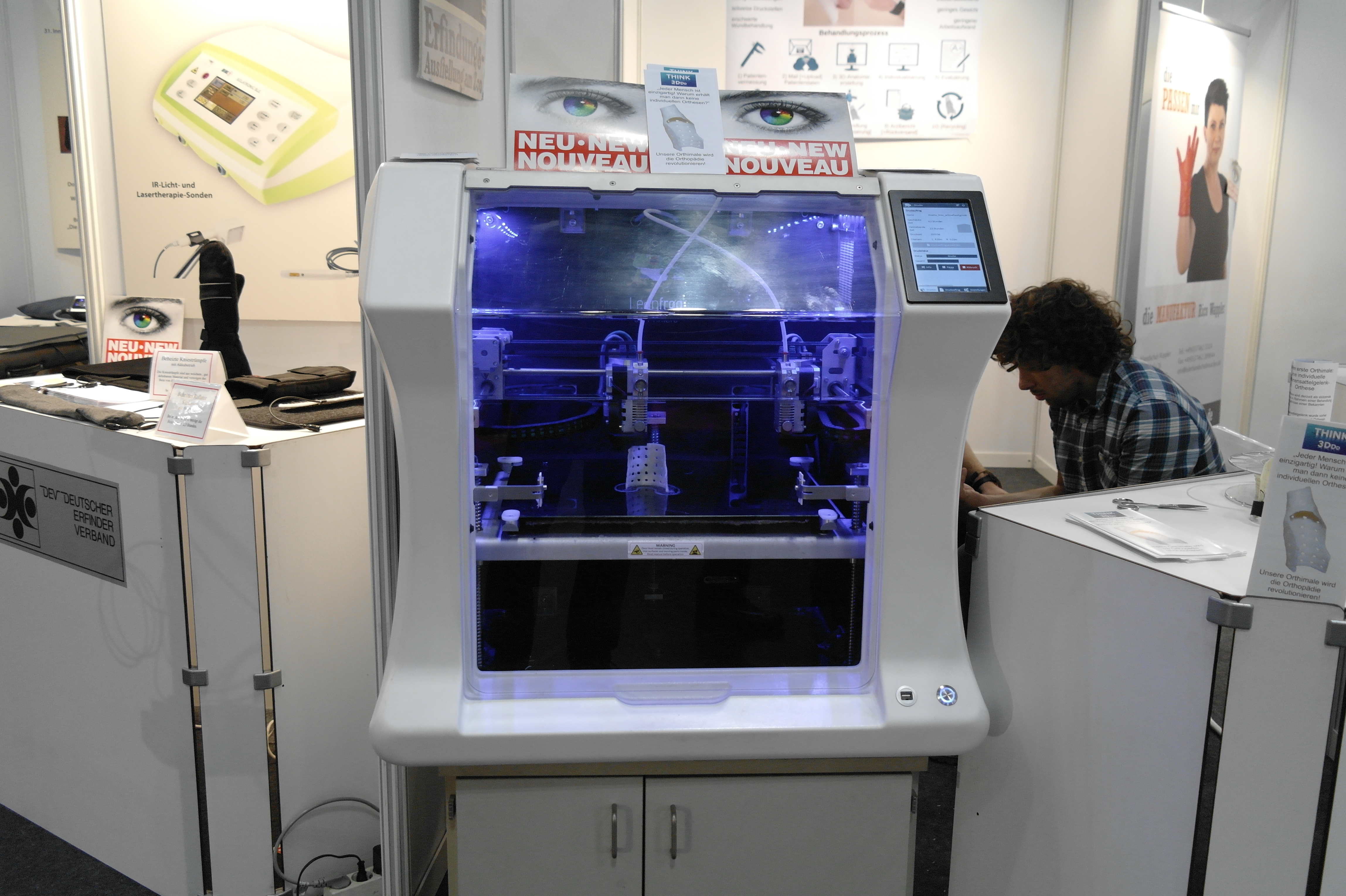 Помимо именитых фирм очень многие используют достаточно бюджетные принтеры для прототипирования ортезов или оснастки.Отдельным стендом выставлялись ребята из WASP.Помимо принтеров они представляли и свой сканер.Даже у самых известных компаний в отрасли, вроде Otto Bock можно было найти те же Raise. Я за всю выставку насчитал порядка 5 штук этих принтеров.Причем головы принтеров были оснащены фидерами от Bondtech. Ибо штатная голова на 2 экструдера весит порядка 900 грамм. Почти килограмм директа на 2 валах 8 мм диаметром. Апгрейд от Bondtech на дуал версию весит 425 грамм.Для изготовления стелек для ортопедической обуви используется скан стопы с последующей его печатью.Так же был обнаружен новенький двухголовый Leapfrog.Тут был недавно пост о печати косметики для протезов. Ее тоже печатают. Не всегда хорошо, но как объясняют, что для примерки отлично подходит, а конечный результат получают при помощи печати на SLS.Крепление всегда осуществляется за неподвижные элементы протеза.