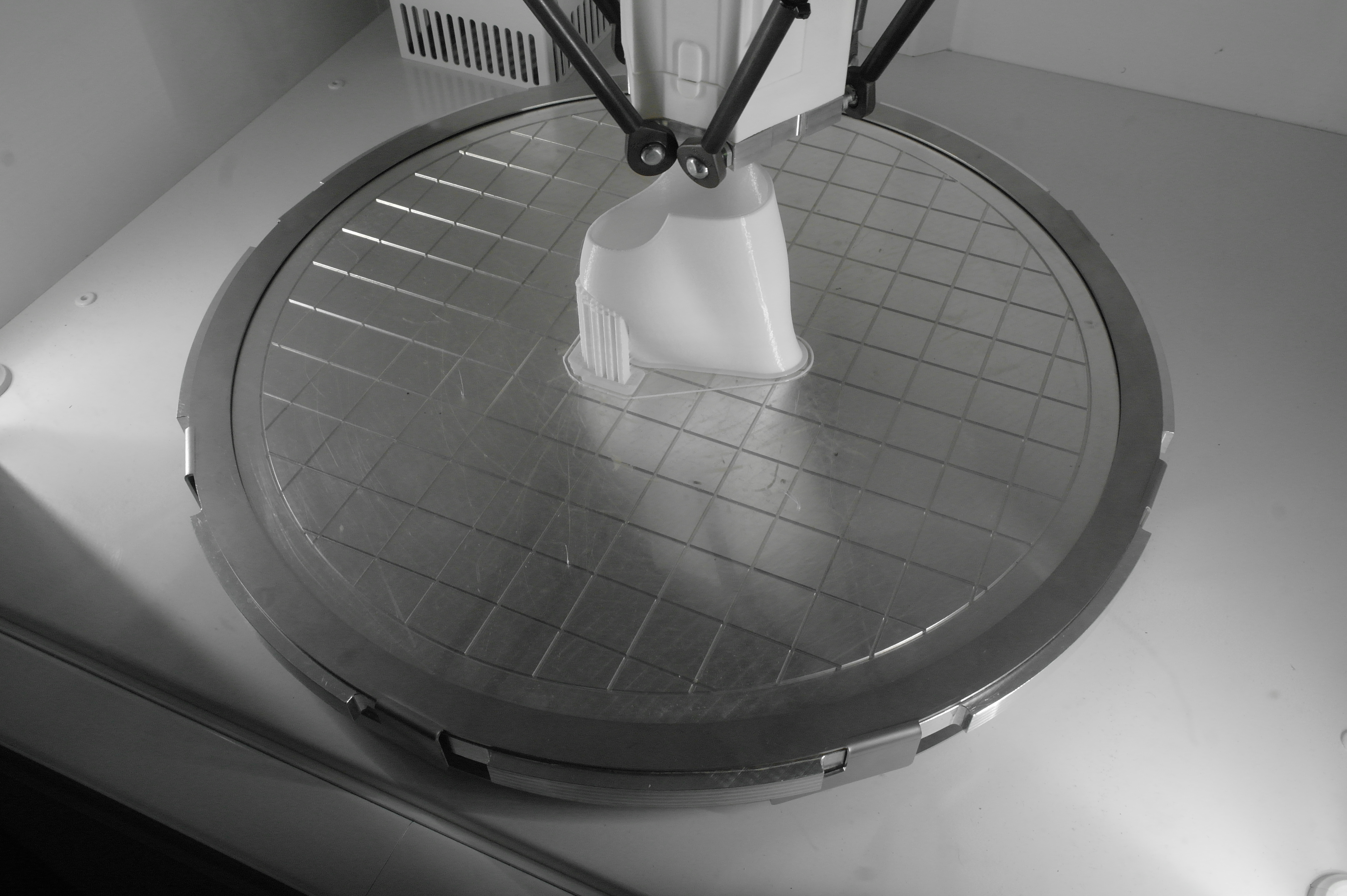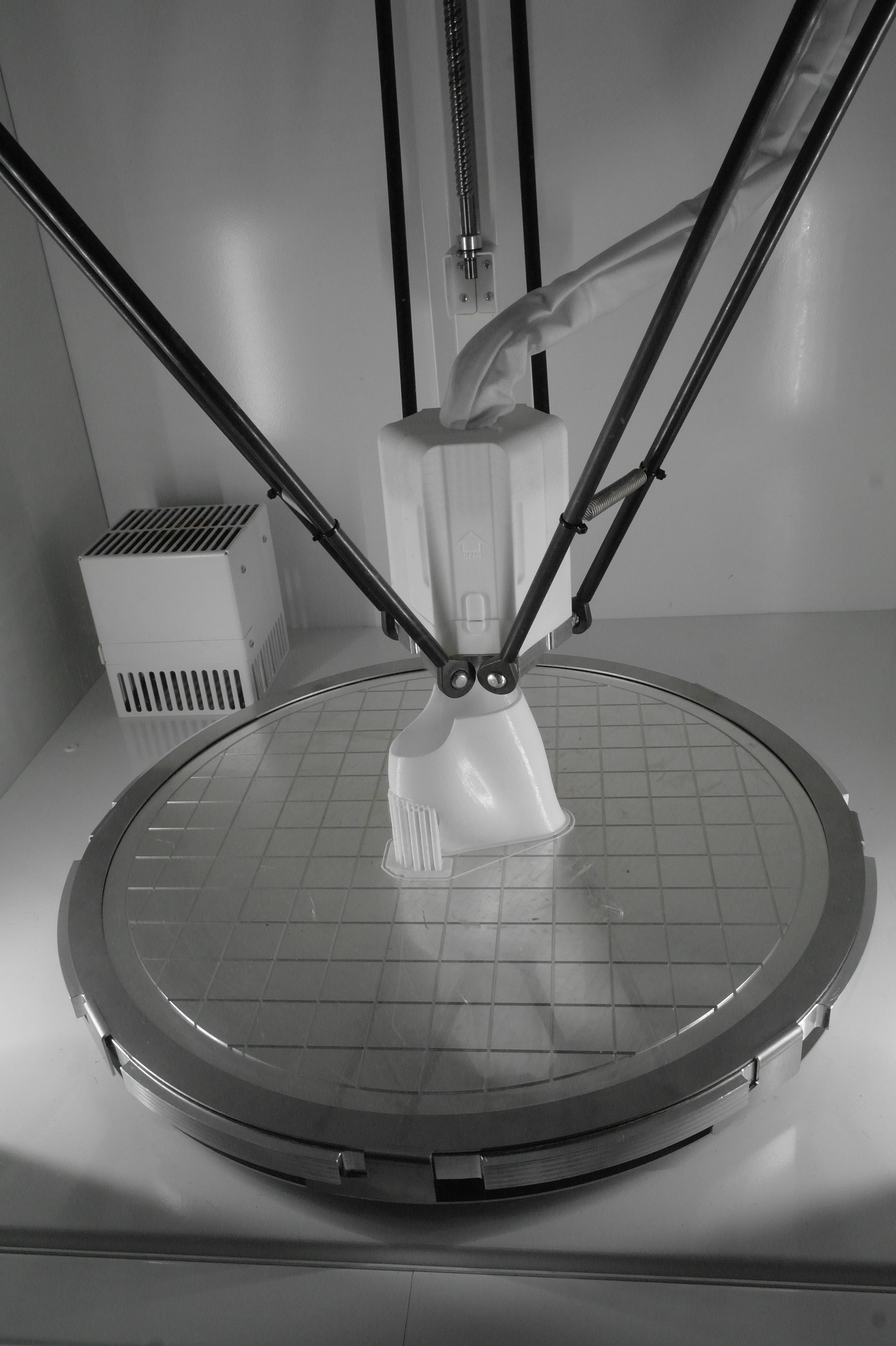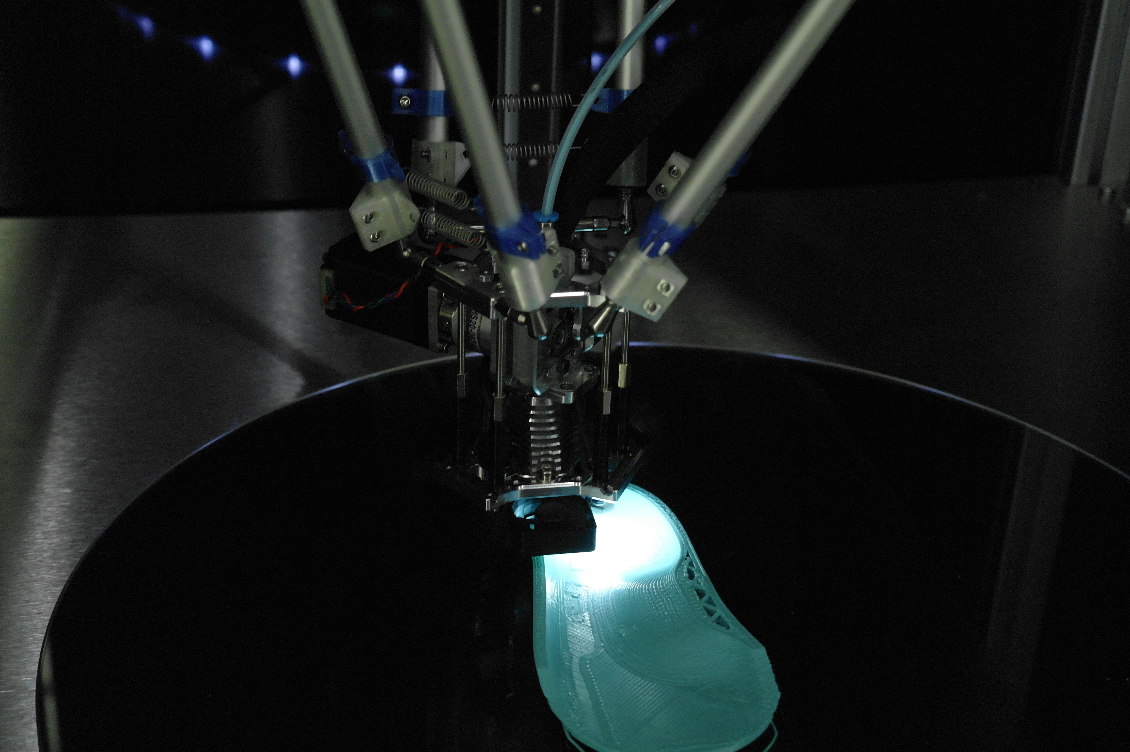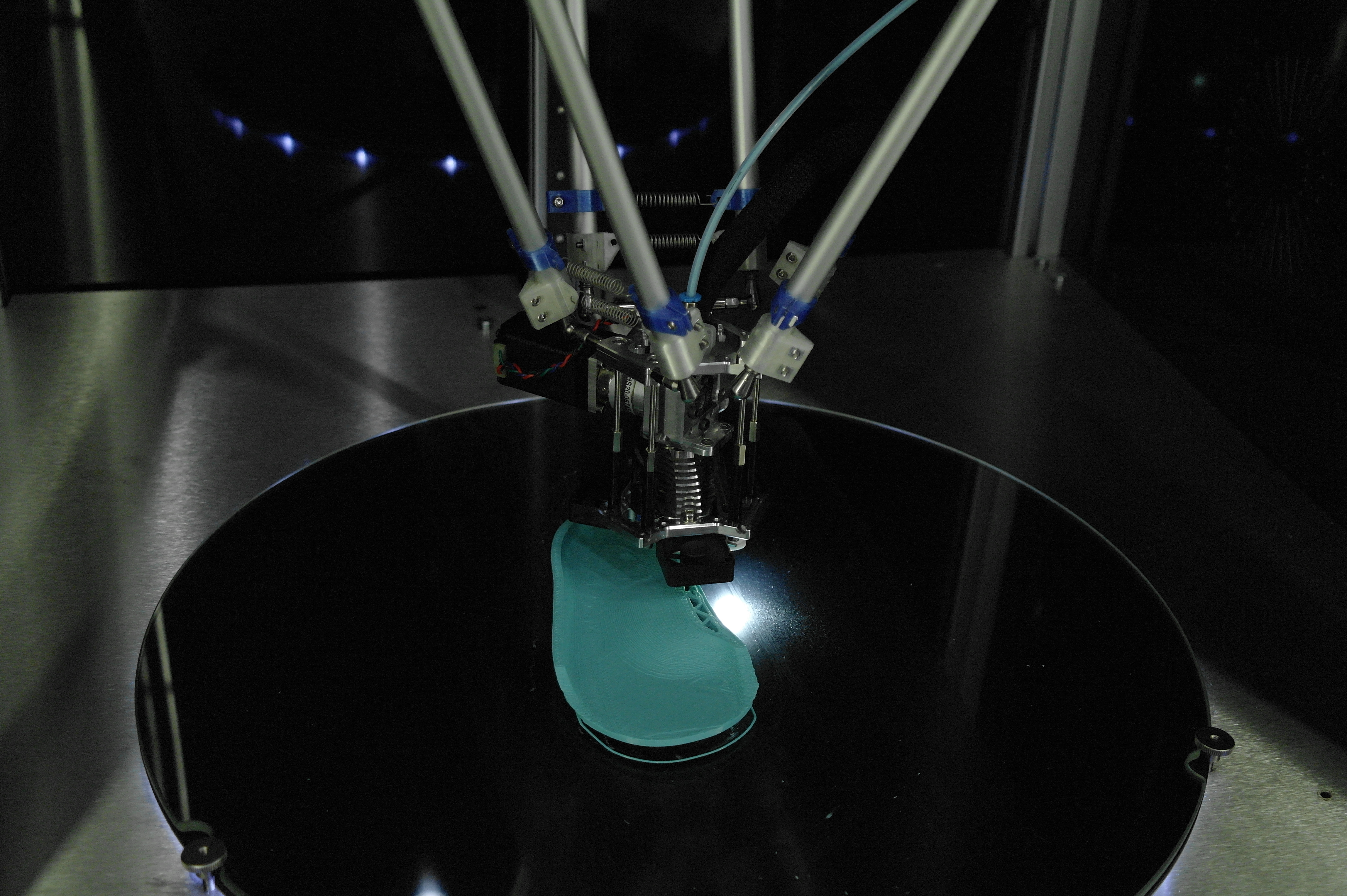 Так же была обнаружена эстонская дельта на колесиках. (Вроде эстонская, а может и нет. У меня она прочно ассоциируется с прибалтикой).Не гнушаются делать ортезы и с явным вобблингом.В целом, чаще пользуются порошковыми принтерами. Но это больше для макетирования или косметики, так как не всегда даже алюминиевые детали способны выдержать циклические испытания на 3 миллиона циклов нагружения, а печатные и подавно развалятся. Приятная матовая поверхность от SLS и точность размеров хороша для отливок по печатным мастер-моделям.Для сканирования стоп и не только их применяются такие вот интересные сканеры.Отдельно хочу описать ребят делающих интересные дельты и придумавших как печатать силиконом и менять головы в дельте.У дельты без смены головы привод сделан на хивинах и ШВП. Большой фрезерованный стол позволяет печатать большие детали по сканам.Крепление ШВП снизу выполнено с упором в кронштейн.Вторая дельта умеет давить силикон из шприца или аналогичного устройства. Вернее из двух шприцов, смешивая его попутно в сопле, так как силикон должен быть быстрым, что б застывать за время печати слоя. А так же заменять инструмент на другой - фрезу для гравировки или что-то еще.Эффектор с шариками магнитными, вклееными в алюминиевый эффектор.Трапеция с большим шагом от IGUS, вместе с гайкой. Каретки фрезерованные. Концевики - индуктивные.Примеры печати силиконом.Смена инструмента на видео.