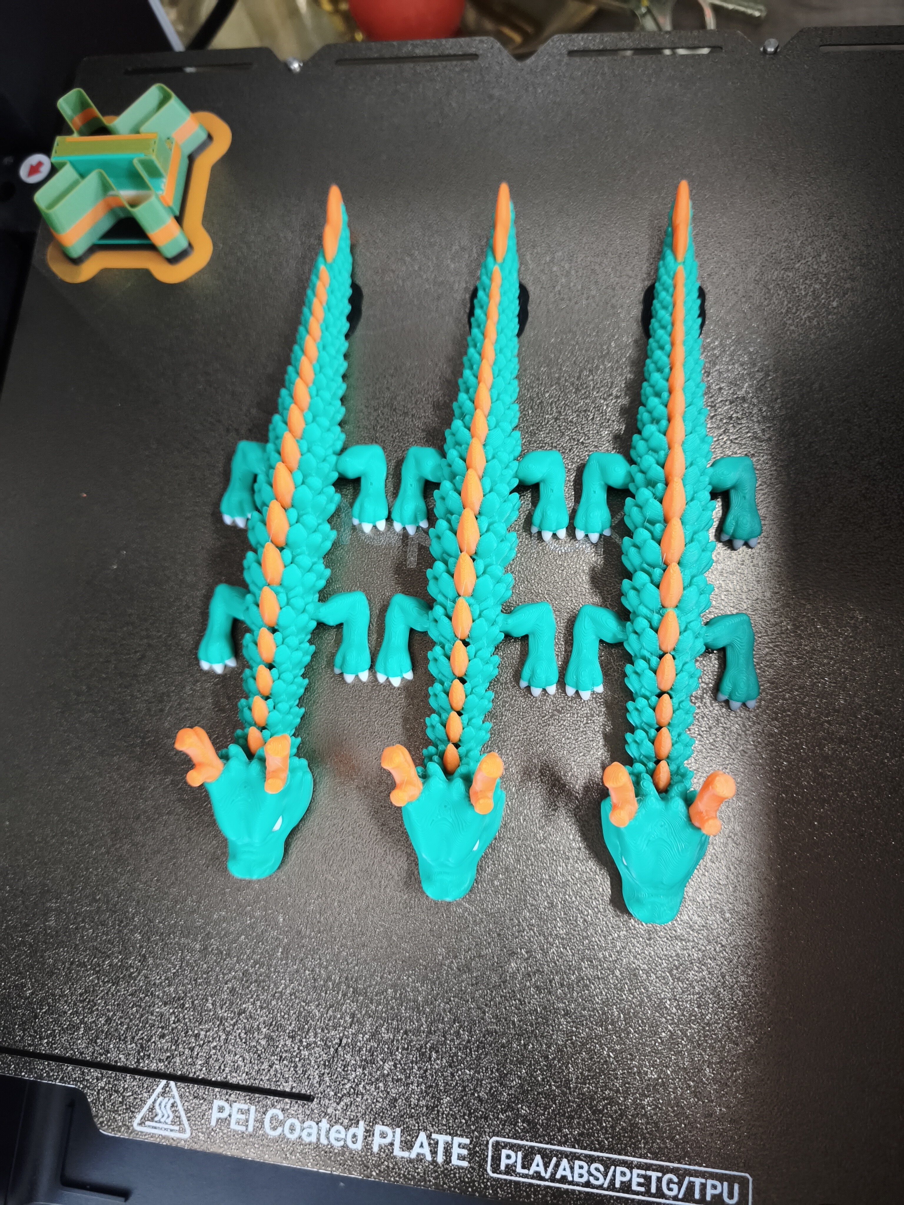 На принтере был дракончик многоцветный, но мне такой печатать было не интересно, поэтому я запустил в первую печать другого цветного дракончика. Три штуки.