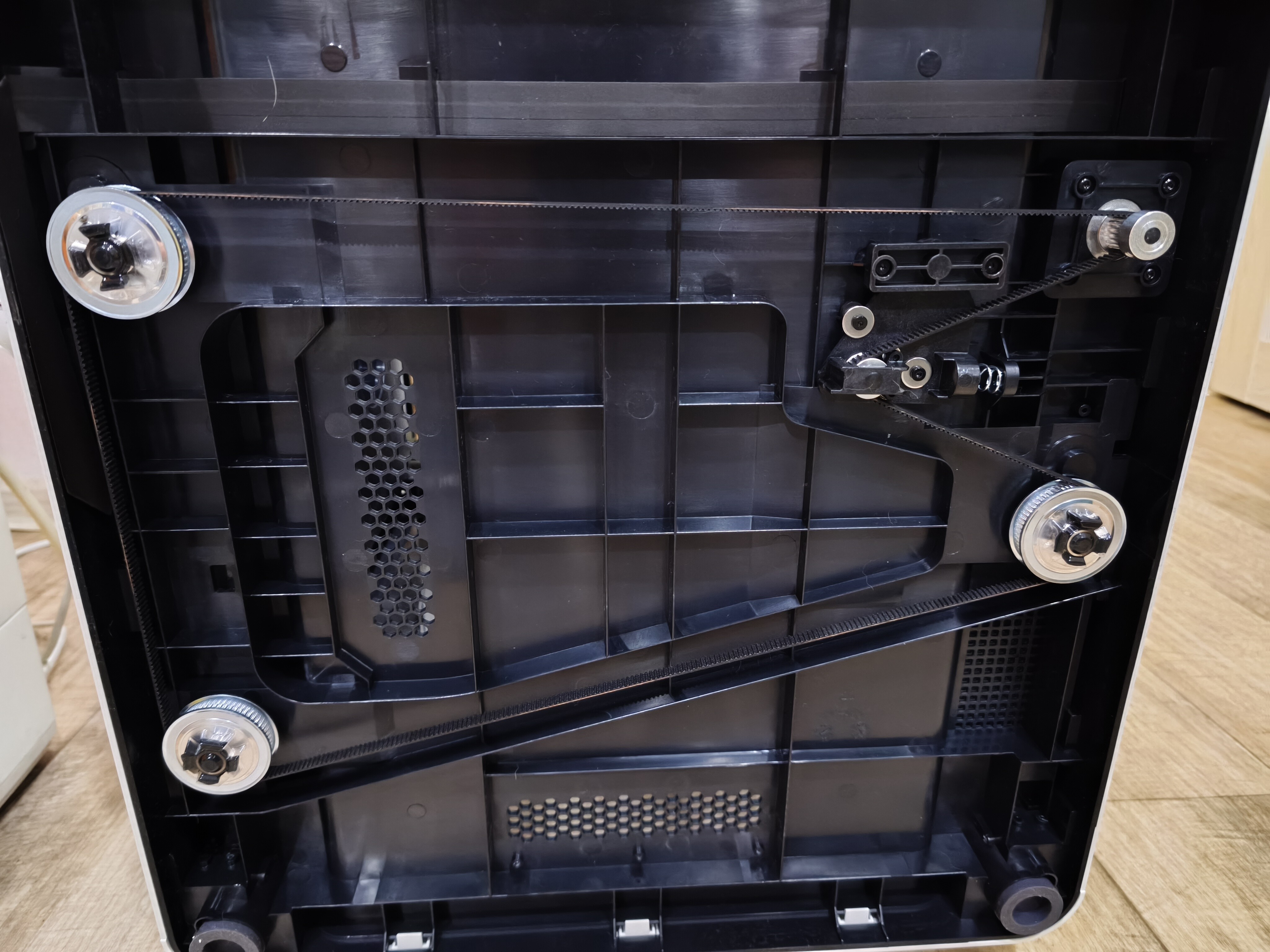 Снизу принтер похож на тот же Bambu Lab, те же 3 винта, связанные одним ремнем.