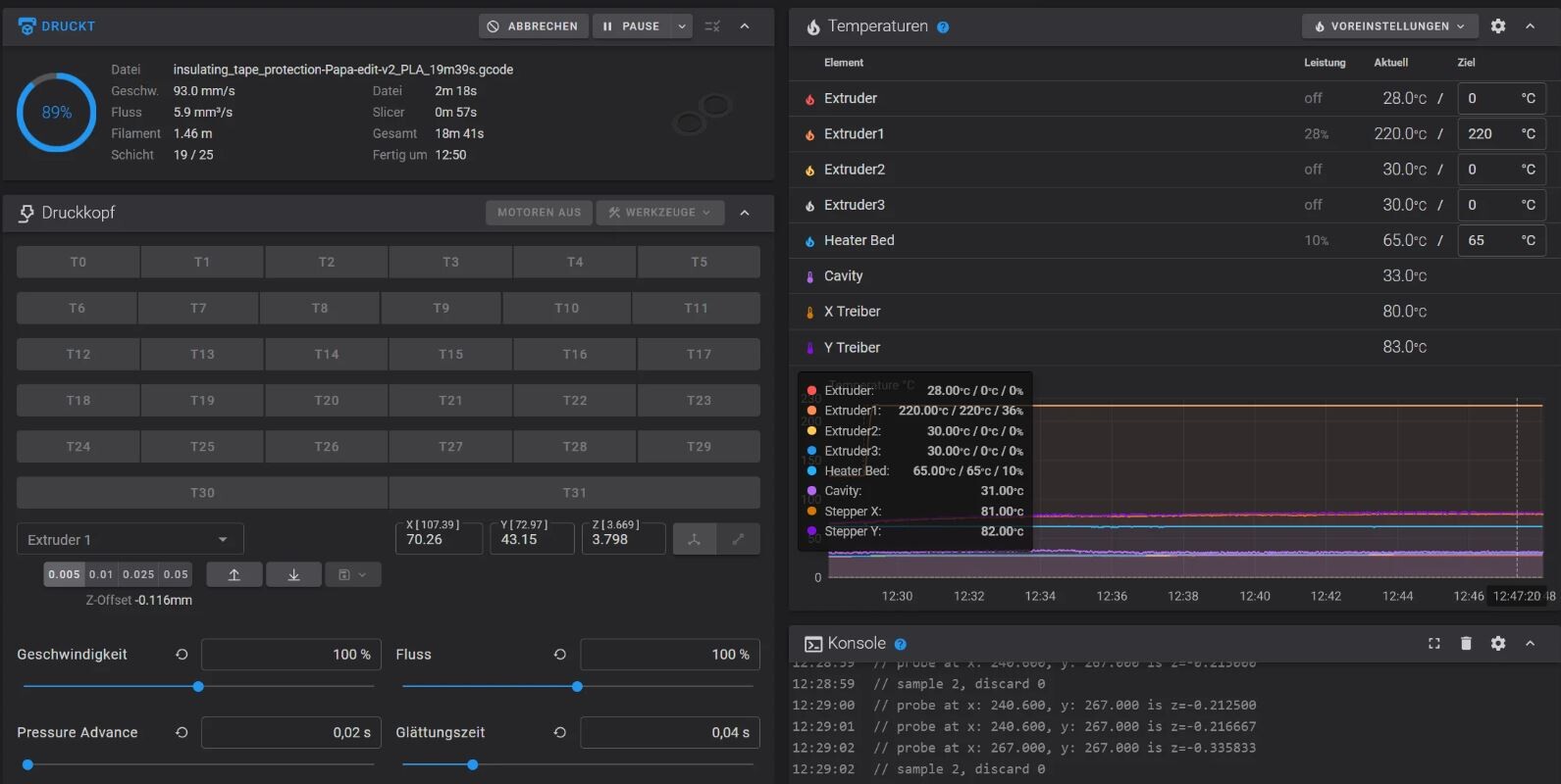 Так же очень багованно работает изменение скорости печати ползунком в принтере. Скорость увеличивается только до смены инструмента и только на этом конкретном слое. Судя по всему это известный баг Klipper для принтеров, у которых инструментов больше одного. Надеюсь исправят. И очень скоро должны уже открыть исходный код.