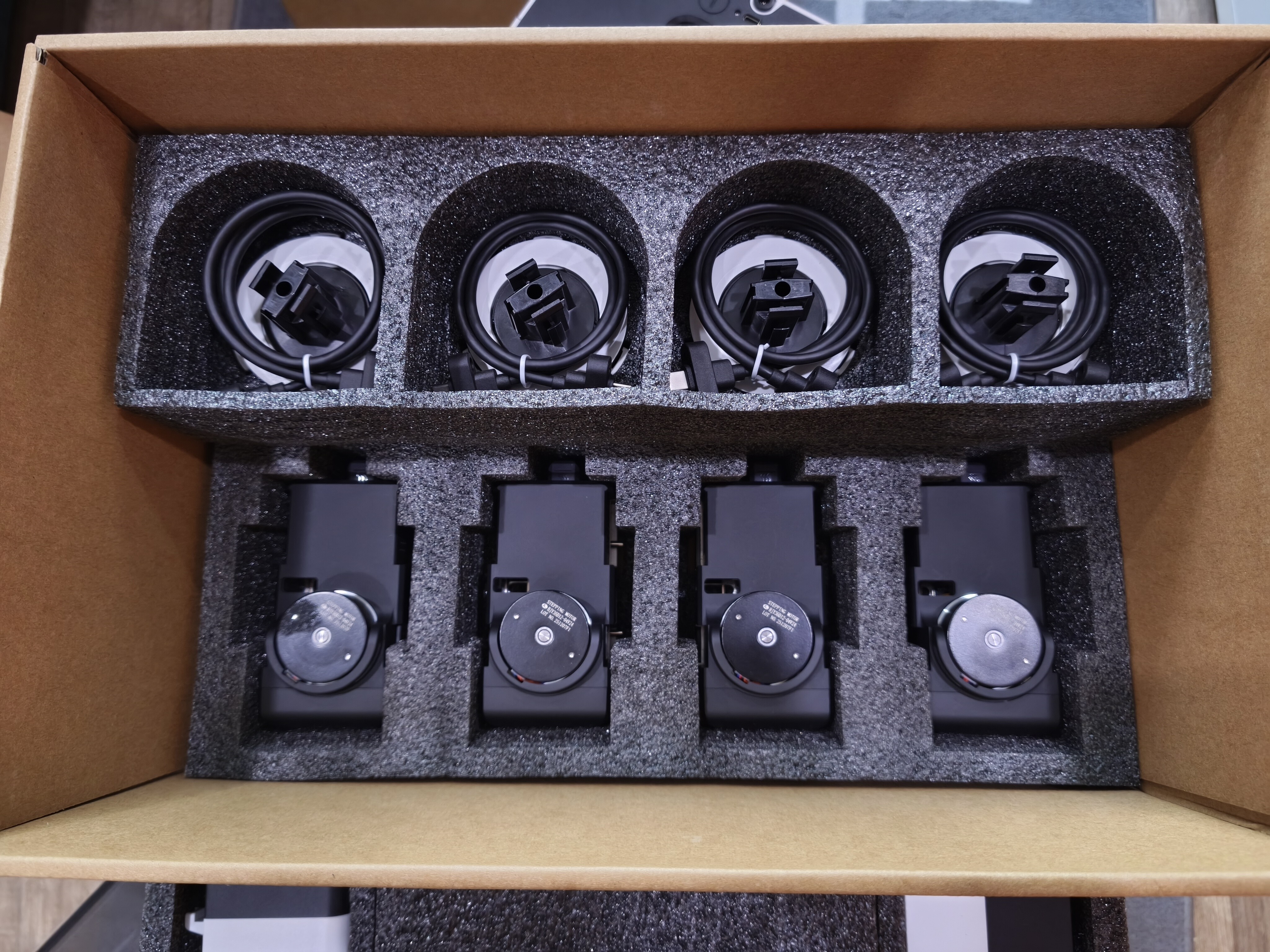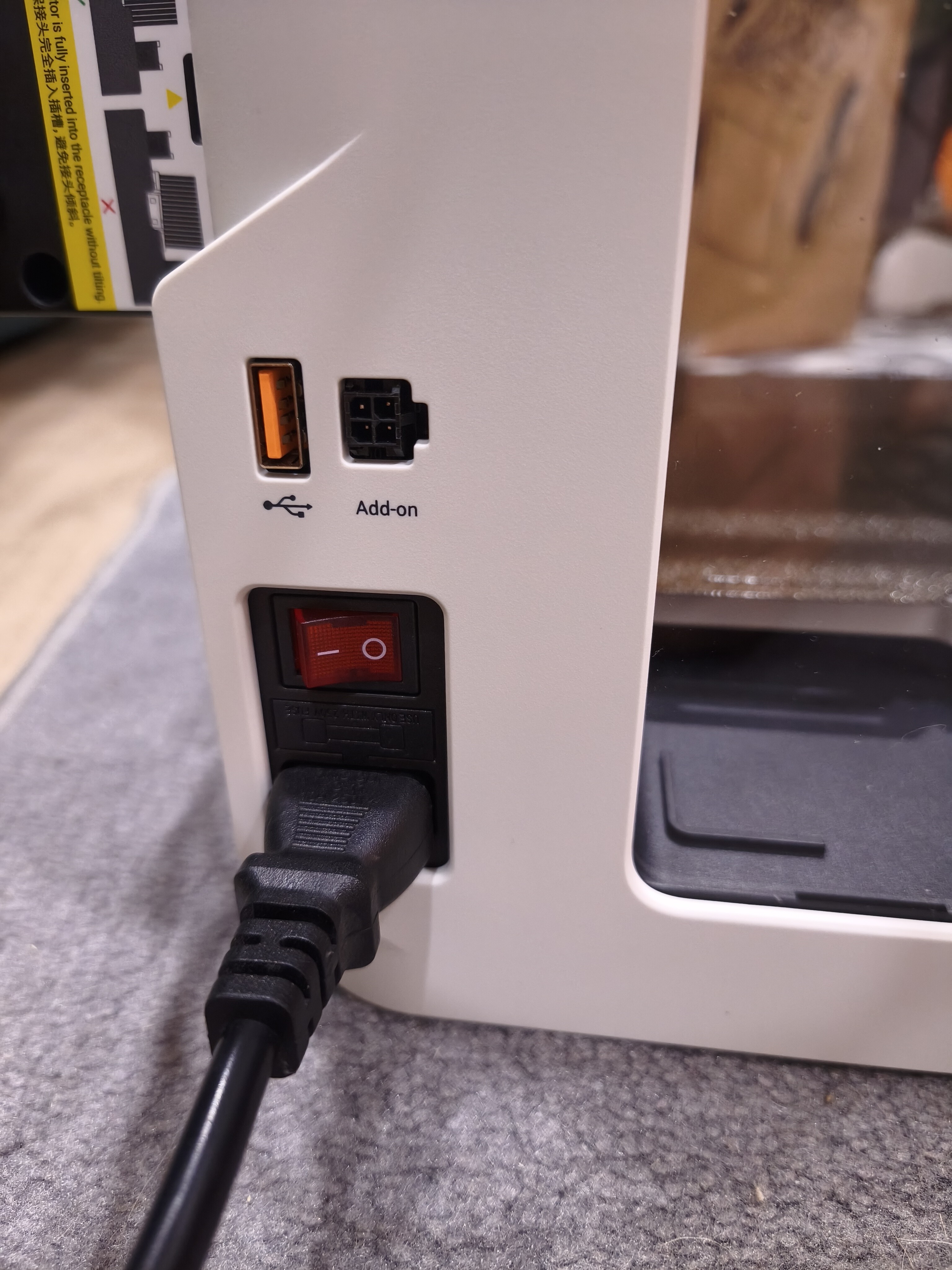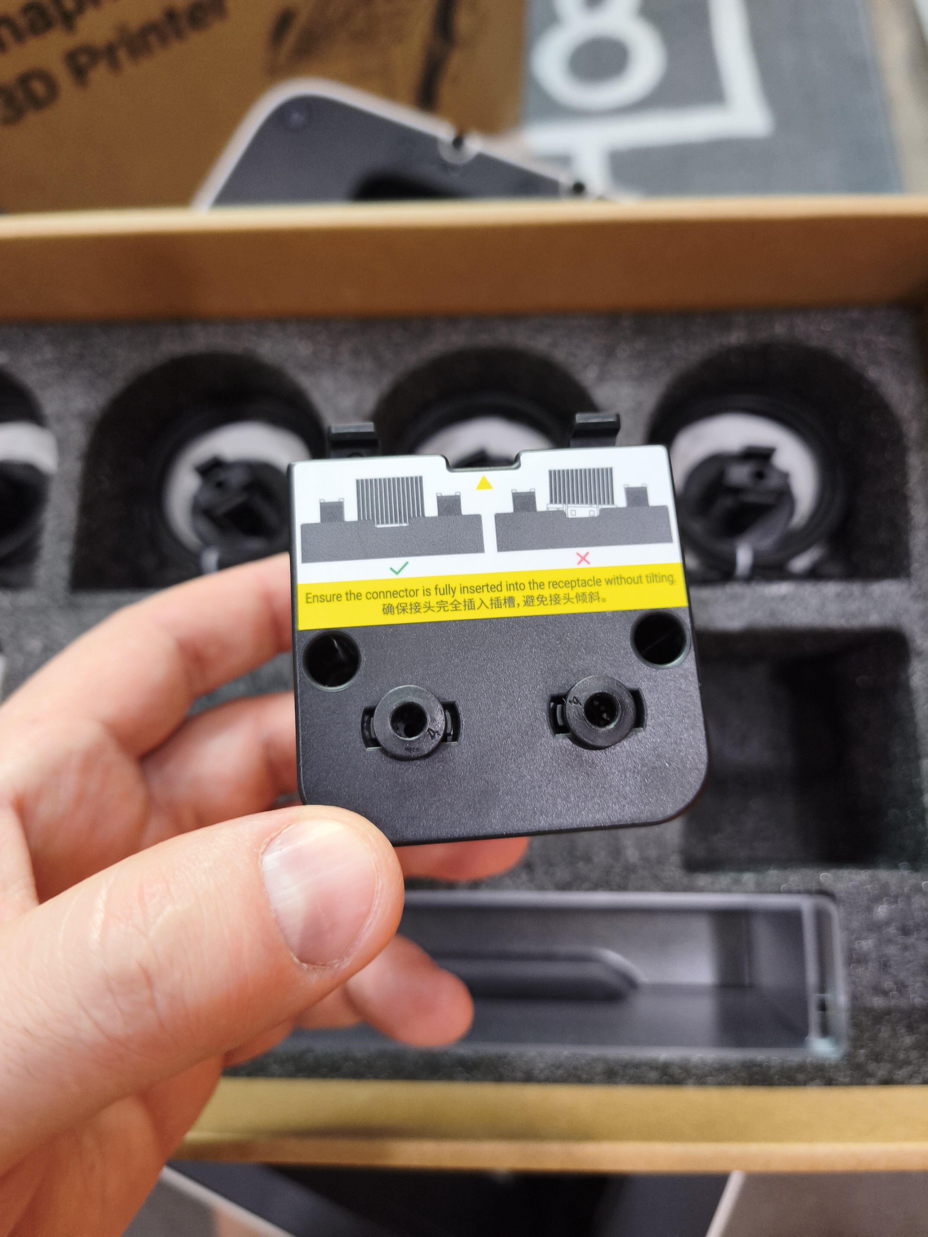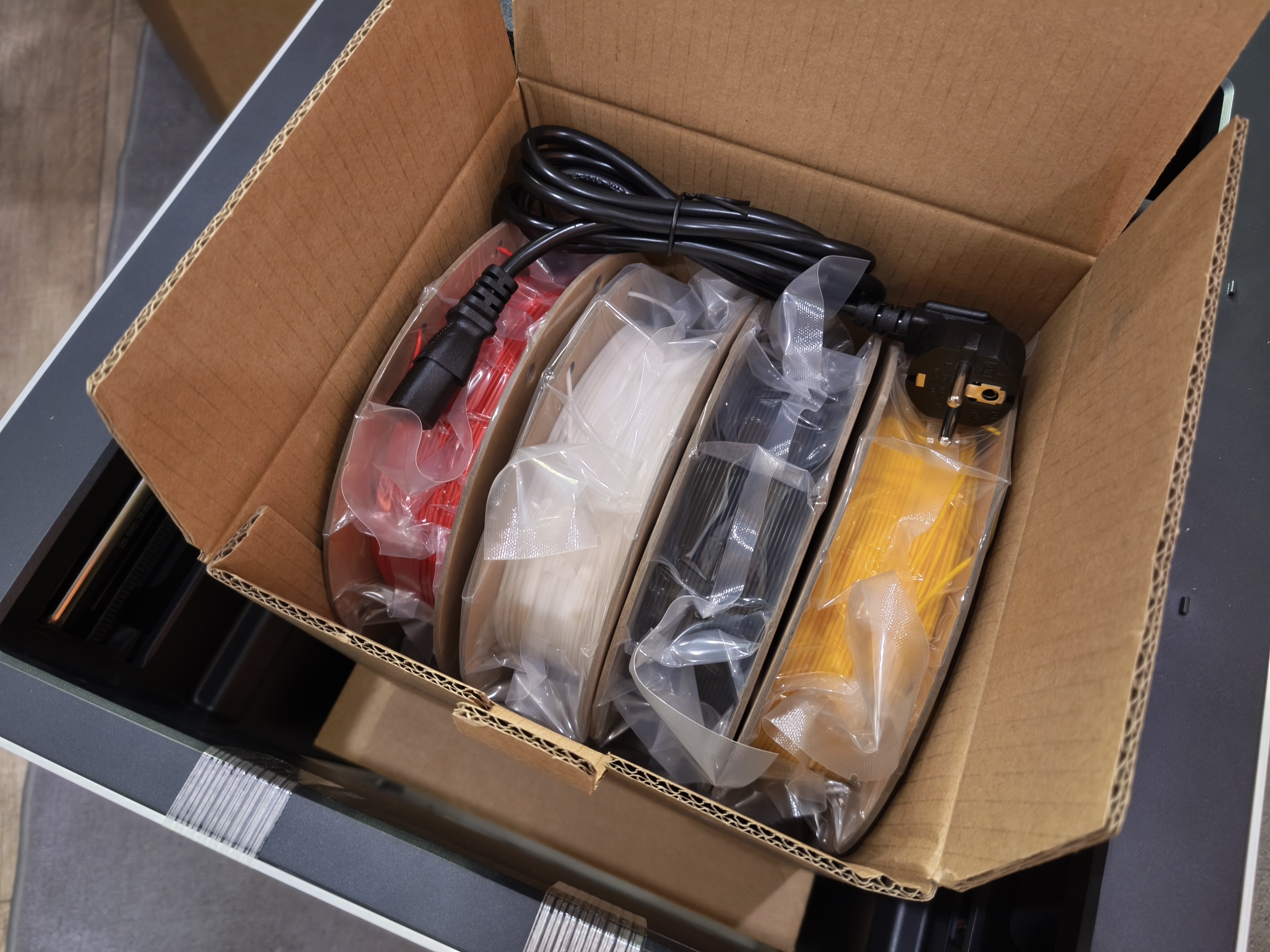 Увидел надпись EU. Ну, думаю, приплыли, и тут региональные блокировки как у Bambu Lab. Открыл коробку и там 4 катушки PLA по полкило и евровилка для питания от сети. То есть пока EU это просто тип штекера и никаких регион-локов. Хотя, судя по выбору типа региона при включении ( там был либо Китай, либо Европа) видимо, выбирается сервер, через который будут идти данные. При выборе Европы данные идут через AWS компании Amazon, в случае Китая, видимо внутренние серверы.