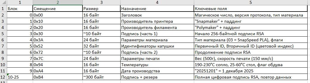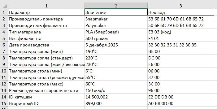 Насчет меток. Попытался я прочесть метки с комплектных катушек при помощи Chameleon ultra. Единственное, что могу сказать - разработчики учли опыт меток Bambu Lab и дополнительно зашифровали содержимое. Брутфорсом ключи к секторам были найдены, но из полезного и читаемого содержимого было найдено только, что метка для принтеров Snapmaker, производитель филамента Polymaker, дата 20251205 (вероятно дата производства, 5 декабря 2025 года ) и вес катушки 500 грамм.