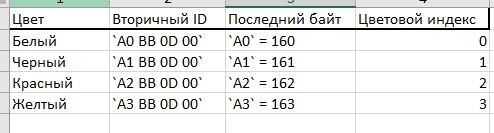 Желтый: 5A B5 0D 3A 15 24 87 87 87 69 ...