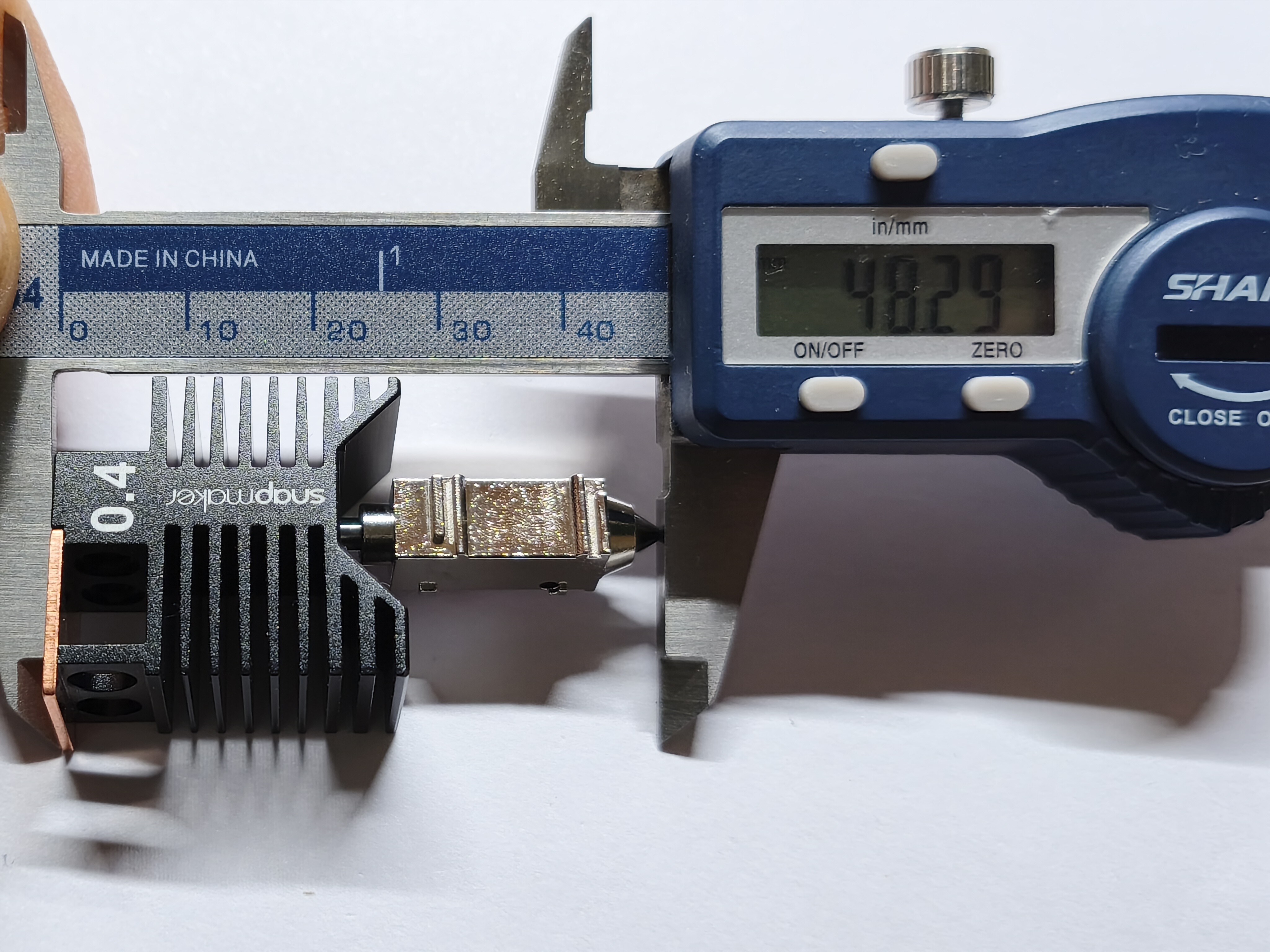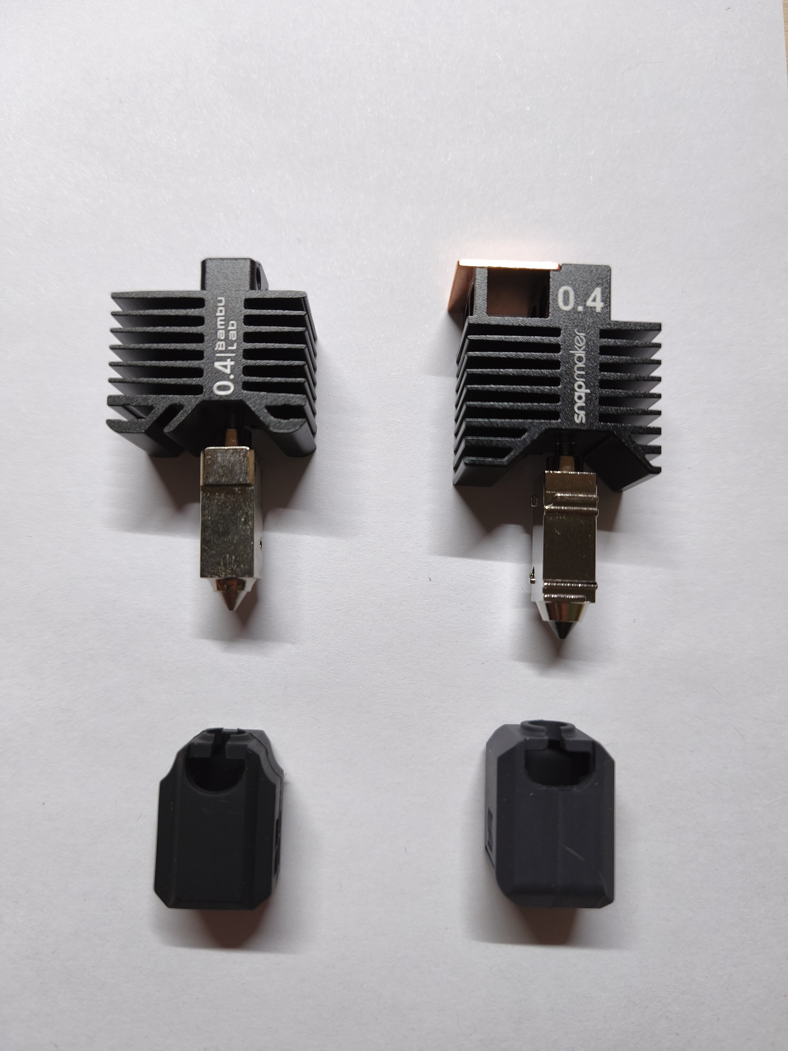 Хотенды похожи на бамбулаб, но не такие. Да, концепция та же: керамический плоский нагреватель крепится к кубику, который с термобарьером впрессован в прямоугольный радиатор. Но размеры немного отличаются.