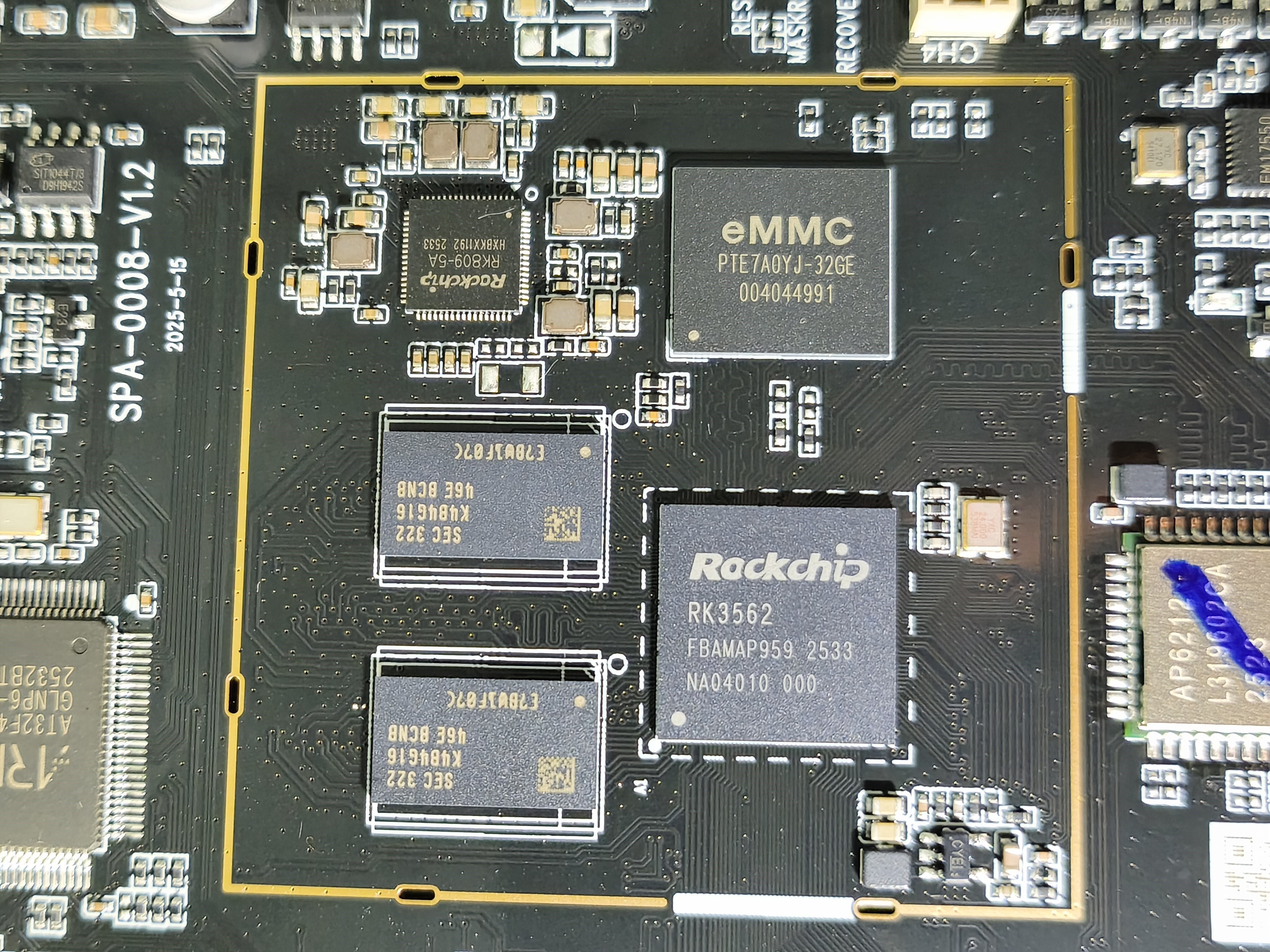 Плата - полный кастом, с RockChip в виде хоста. Так же есть eMMC на 32 Гб и два Samsung чипа оперативной памяти по 4 Гб. Для общения с миром есть чип Ampak с WiFi + Bluetooth + FM.