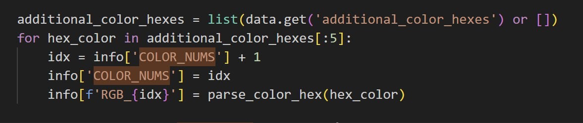 То есть из метки мы получаем цифровой код, далее по карте additional_color_hexes получаем код цвета вида #FFFFFF, например для белого пластика.