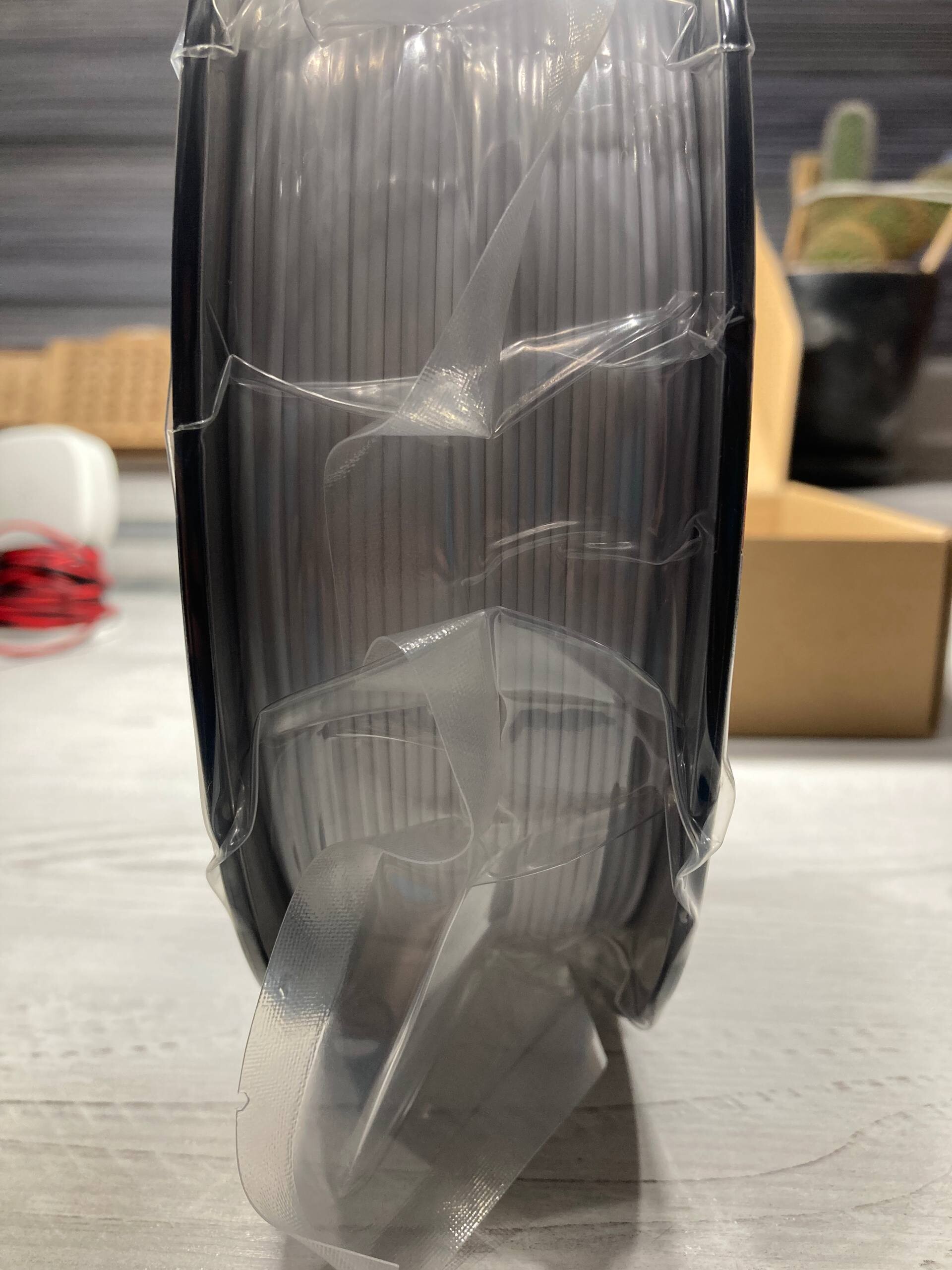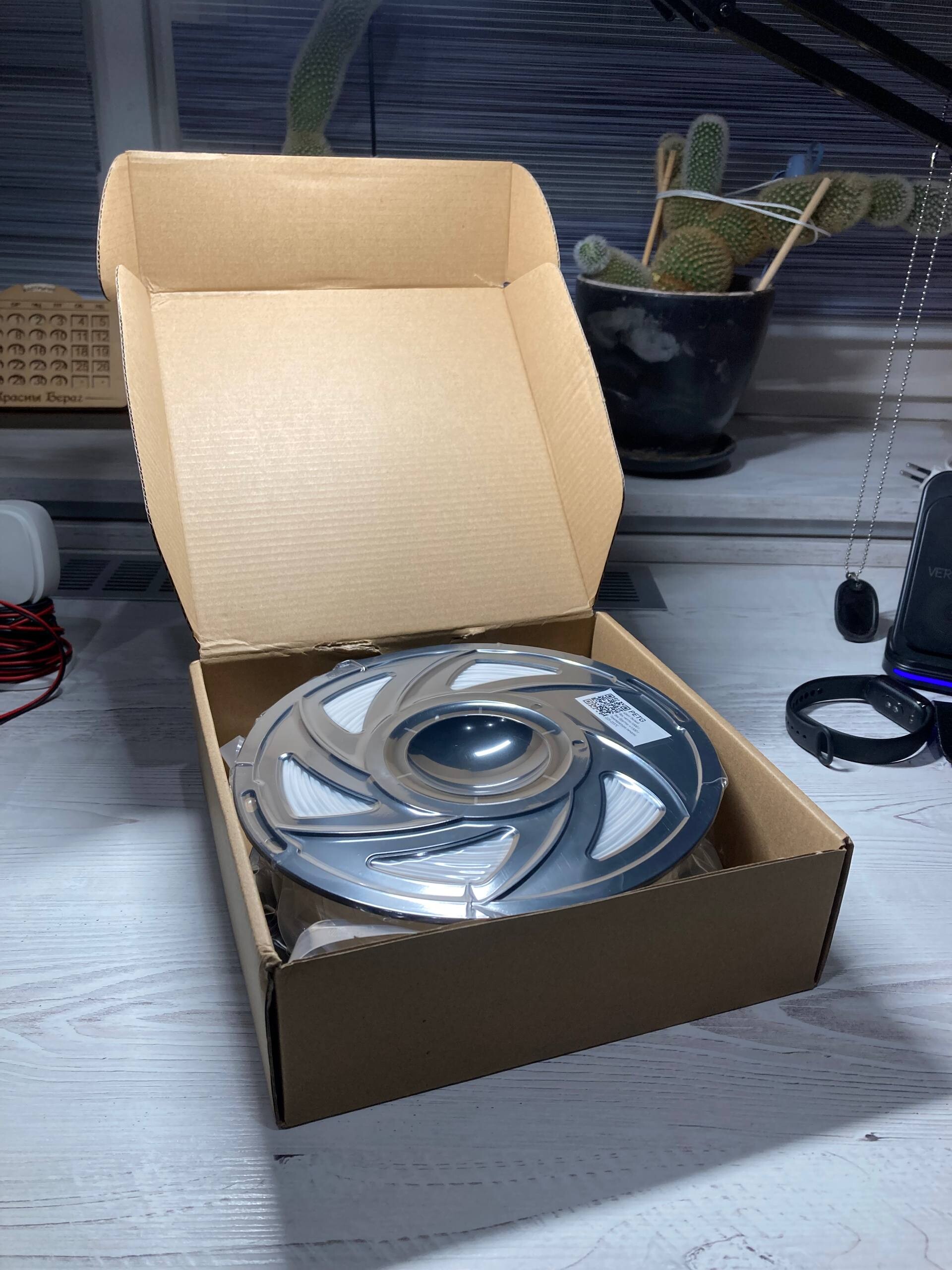 Катушка была упакована в плотную картонную коробку. Коробка нормального качества, не разваливается в руках. Внутри — вакуумный пакет с силикагелем. Вакуум хороший, видно, что пластик не просто «для галочки» запаковали. PETG пришел сухой, что сразу радует.
