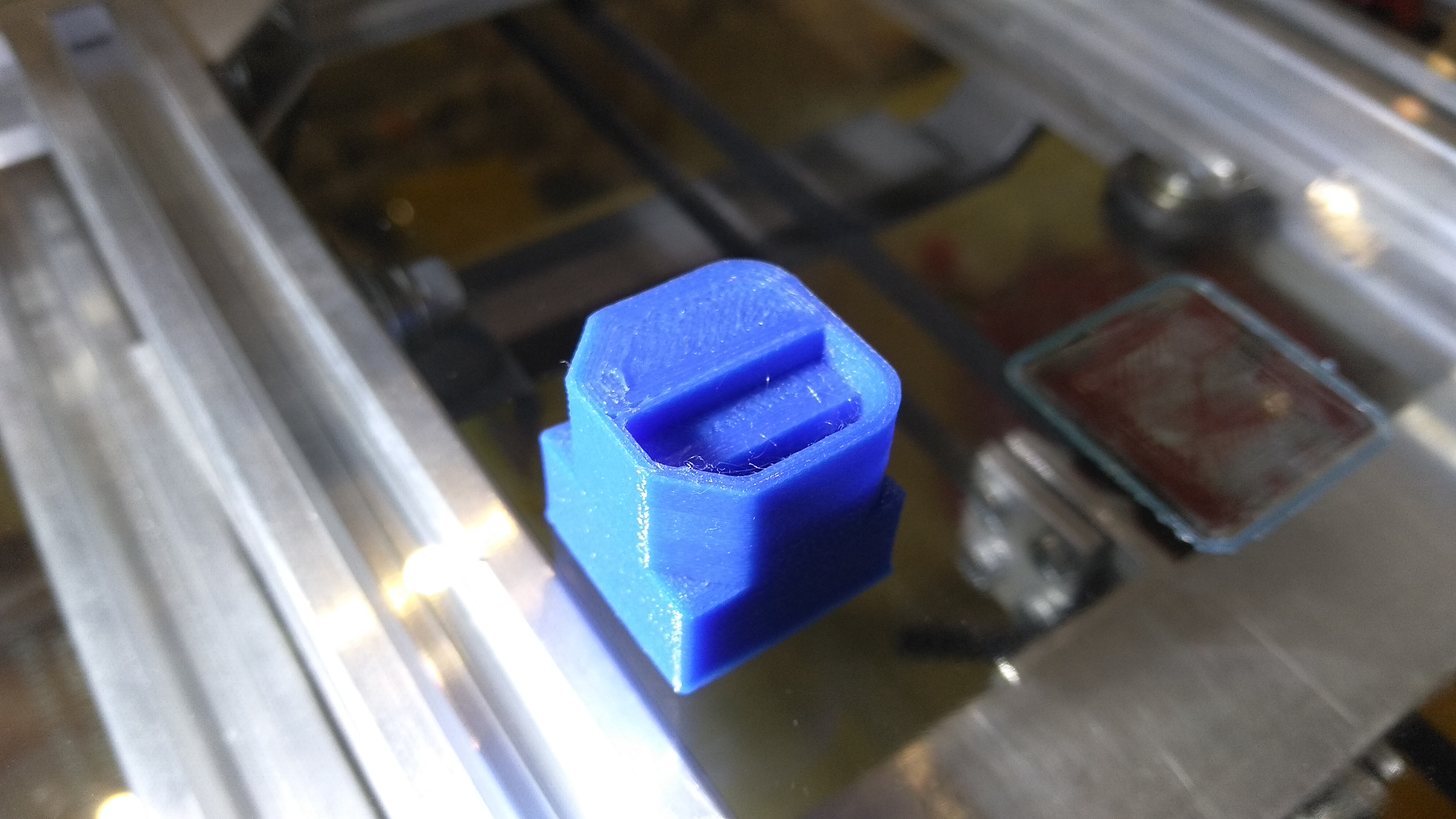 Ну, а дальше, как полагается, испытания на прочность... Бил я его носом молотка, тонкие стенки сдались после двух - трех ударов, закрытый объем (заполнение ставил 30%) выдержал более пяти ударов... Заключение - печатать леской можно, но нужен подогрев стола и видимо температуру сопла надо увеличивать для лучшей спекаемости слоев. Нагреватель я уже заказал, ждемс...