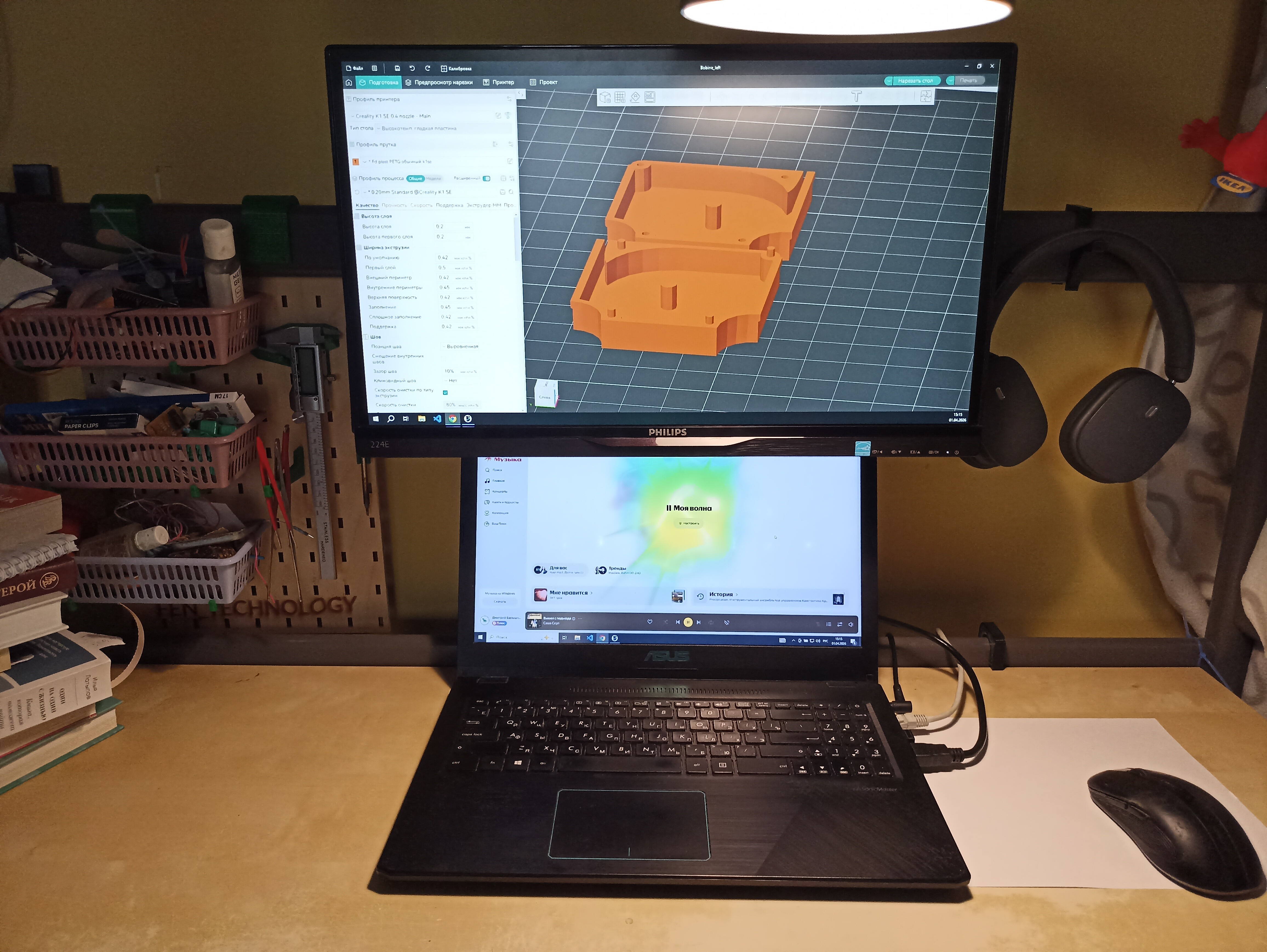 Печатал из PETG-пластика, увеличив в слайсере все прочностные характеристики: заполнение, количество стенок. Сборка не представляет никакого труда, дополнительно под крепление VESA вырезал прокладку из мягкой наклейки.