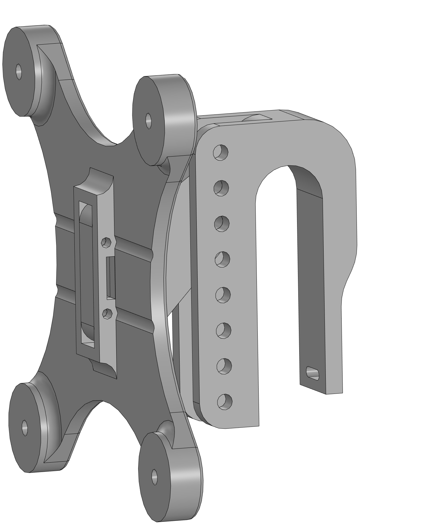 Но мы, 3D-мейкеры, найдём решение для любой задачи с помощью 3D-принтера. Сама задача тривиальная и не требует долгих размышлений: есть металлическая балка, на которую нужно закрепить монитор. Зная особенность напечатанных деталей расслаиваться вдоль слоёв, я смоделировал этот кронштейн. Чтобы точно предотвратить расхождение губок, добавил отверстия для хомута (Почему не на винтах? Потому что с отверткой очень тяжело копаться под монитором). Для перемещения вверх-вниз сделал штыревую систему, а перемещение влево-вправо продумывать не пришлось — металлическая балка сама служит направляющей.