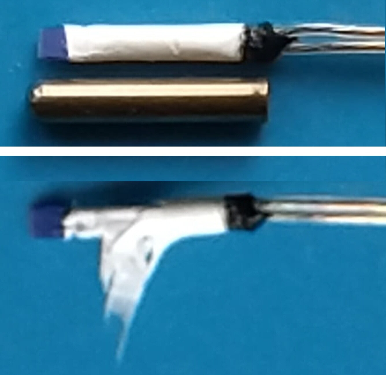 Неожиданно у меня можно сказать что саморазобрался датчик Pt1000 в корпусе из нержавейки, без проблем проработавший года этак три, если не больше. И претензий к нему не было никаких ни раньше, ни сейчас; просто затеял я поменять силиконовый носок на кубике, с голубого (обычного) на красный (высокотемпературный). Расслабил винт крепления, как всегда легонько потянул за провода, и вынул голый датчик без одёжи. И вот как оно выглядит (датчик с капсулой совмещены по следу капсулы на компаунде): (сорри за плохую резкость на втором фото; сразу не проверил, а потом уже было поздно).То есть вовнутрь капсулы китайцы, судя по всему, запихивают датчик M222 от Heraeus. Выводы заизолированы какой-то очень тонкой белой лентой; лента в монолит не спеклась (датчик за свою жизнь два-три раза разогревался до 330 градусов!) но разделяется этот белый кокон очень не охотно - растащить на слоистую тряпочку можно, но размотать слои не получается. И с капсулой-корпусом лента тоже нигде не спеклась.