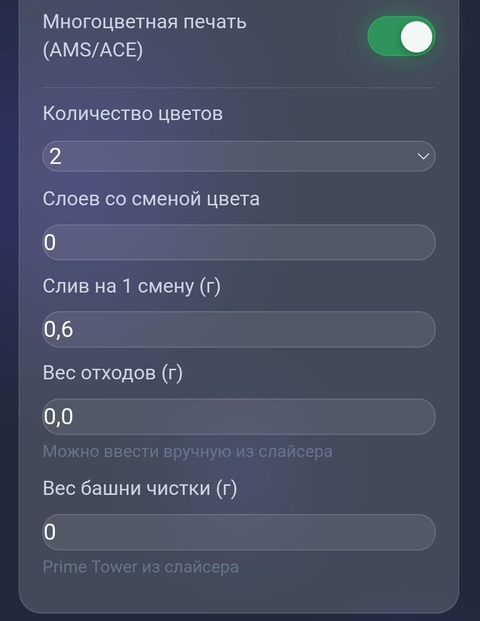 Отдельно проработал расчёт для многоцветной печати. Когда включаешь AMS — появляются дополнительные поля: