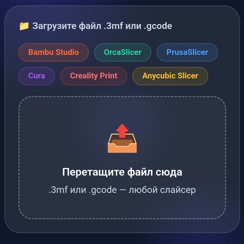 Разные слайсеры записывают данные в файлы по-разному. Bambu Studio использует свой формат slice_info.config внутри архива .3mf, PrusaSlicer пишет данные в комментарии GCode, Cura использует свой формат. Пришлось написать парсер с несколькими уровнями fallback — если один формат не распознался, пробует следующий.