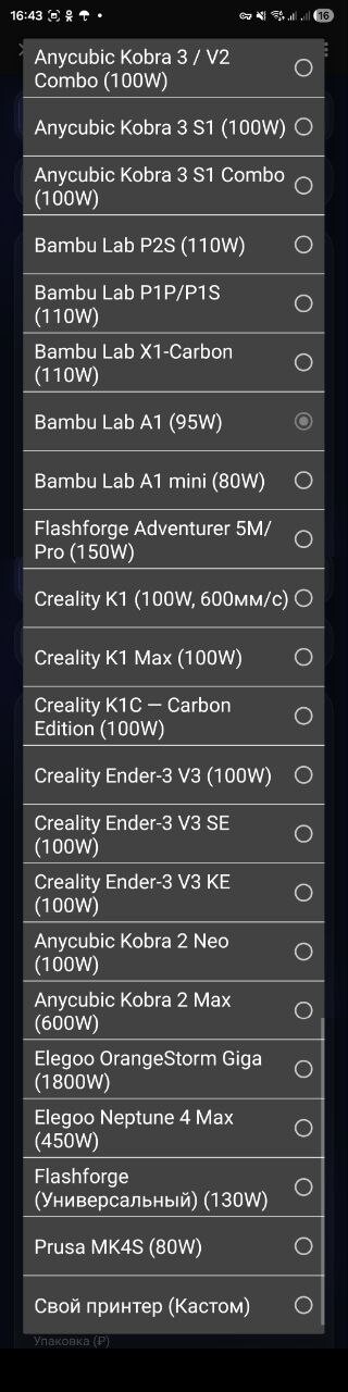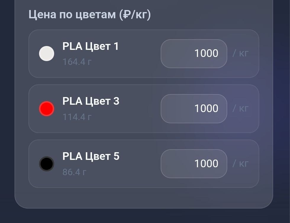 Отдельно продумал логику амортизации. Флагманы стоят в разы дороже бюджетных принтеров — значит и амортизация у них должна быть выше. X1-Carbon с лидаром и дорогими расходниками — это не то же самое что Ender 3.