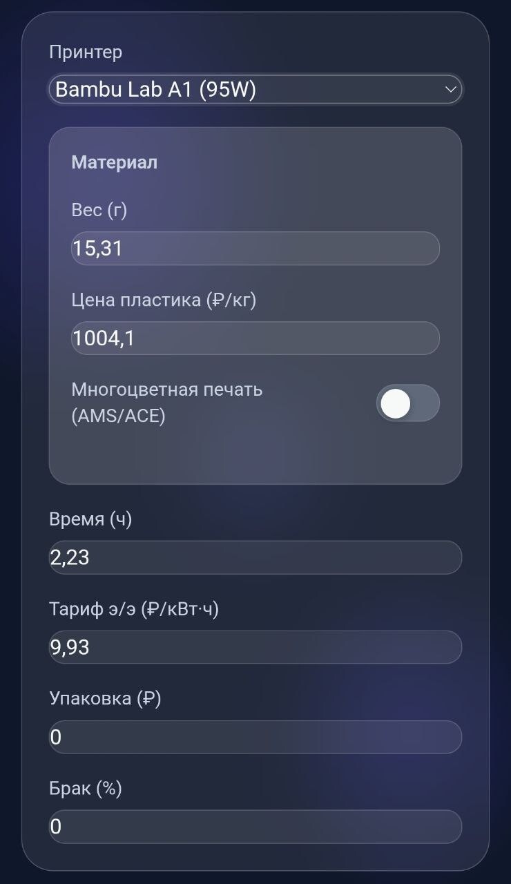 Казалось бы — простой вопрос. Но когда начинаешь считать вручную — вес модели, цена пластика, время печати, электричество, износ принтера, упаковка, брак — голова идёт кругом. Ошибёшься на пару цифр и продаёшь себе в убыток, сам того не понимая.