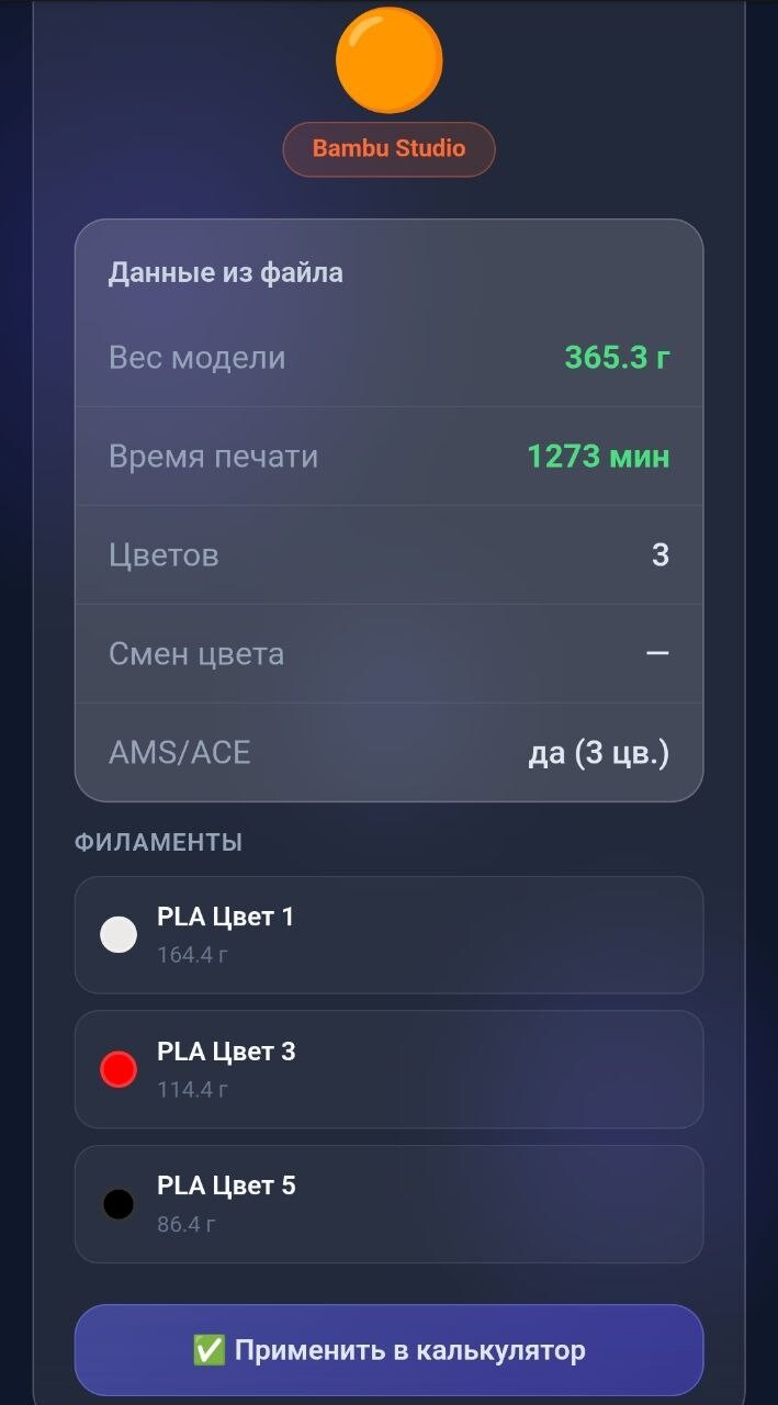 После анализа файла — нажимаешь "Применить в калькулятор" и все данные автоматически заполняются в нужные поля. Остаётся только указать цену пластика и нажать считать.