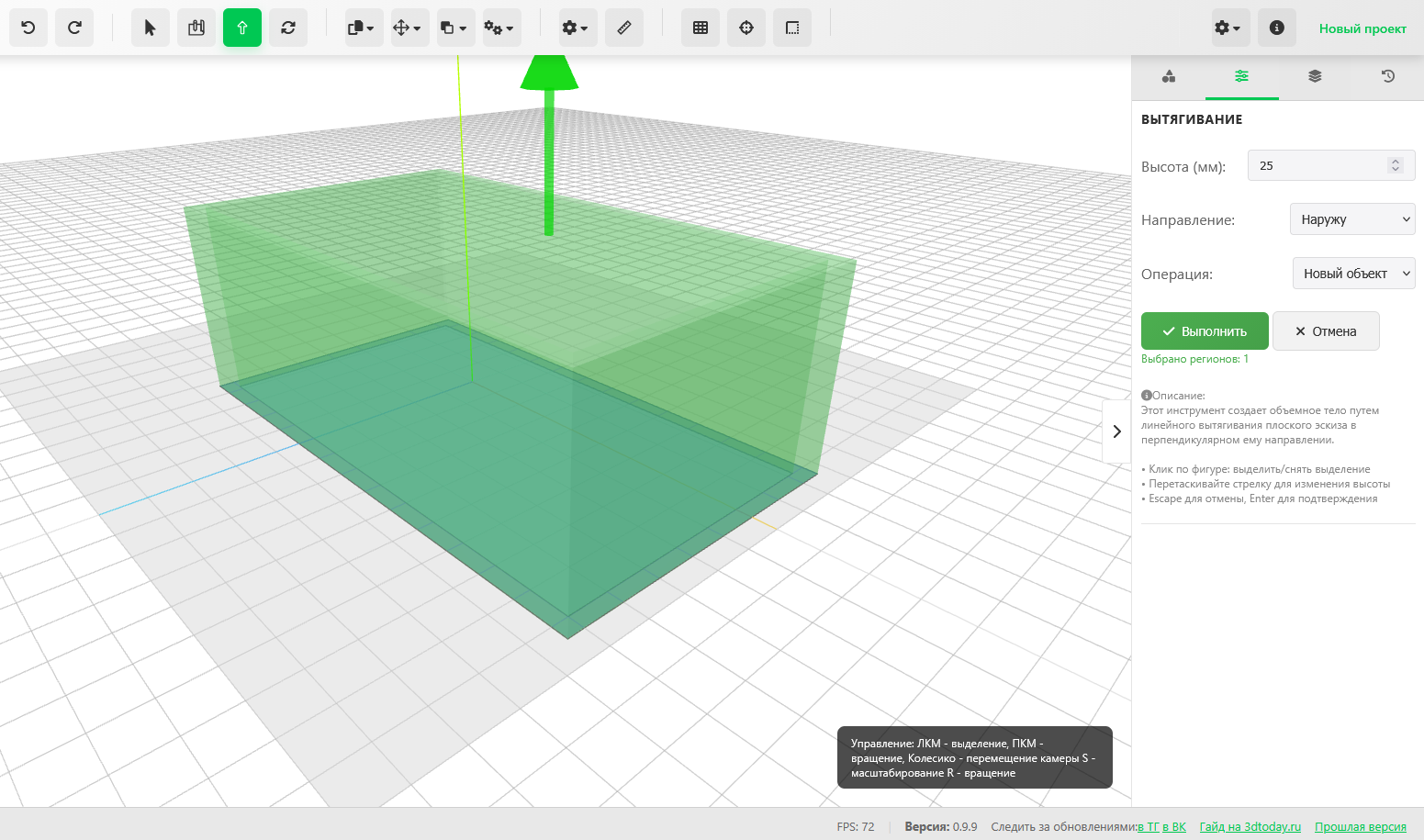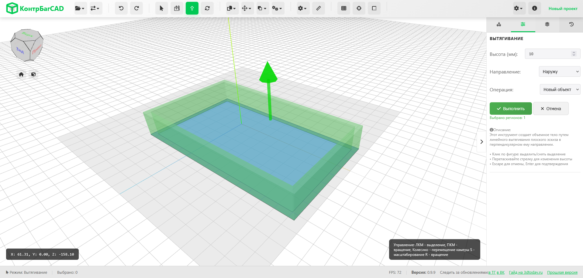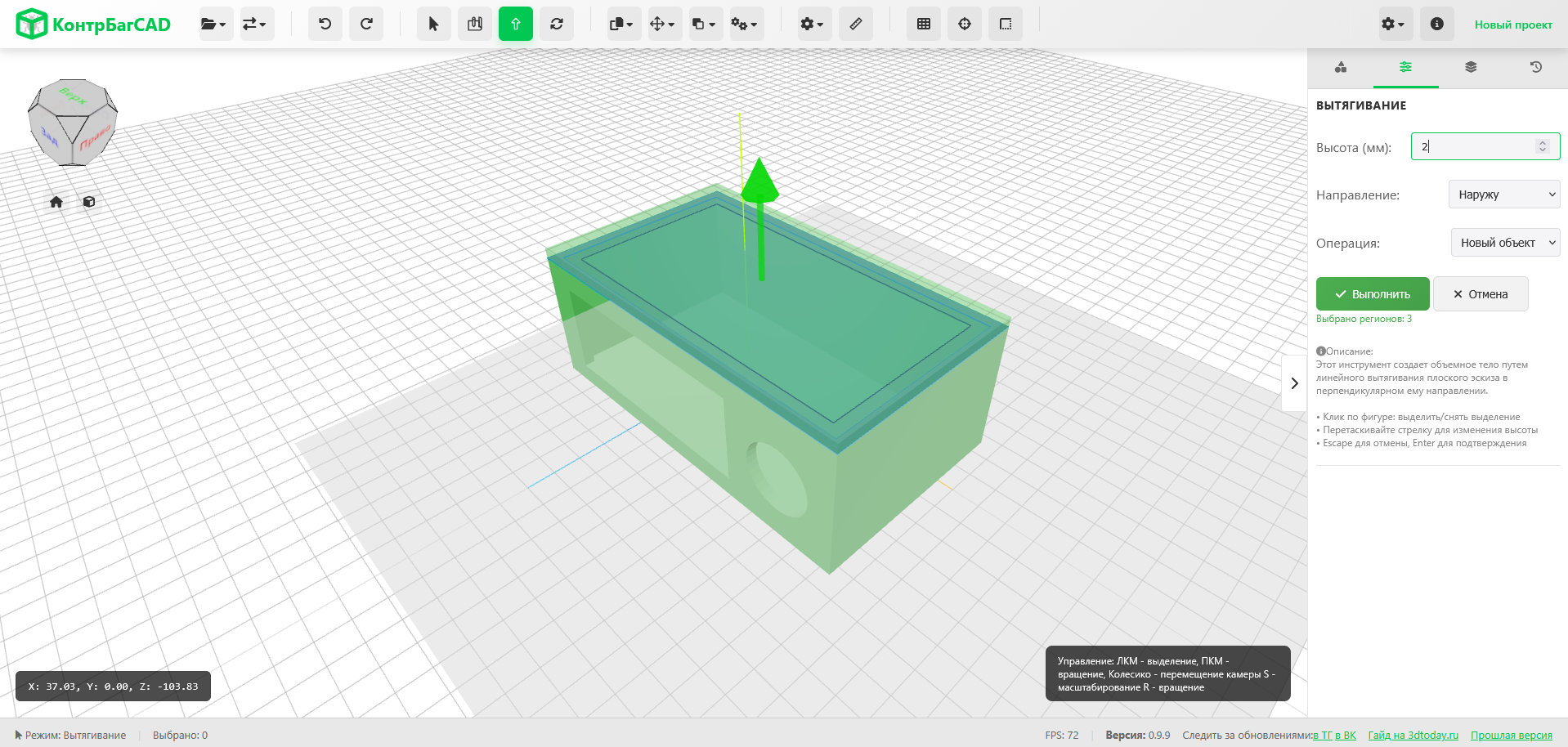 Вытягивание работает максимально просто и, кстати, аналогично большинству САПР. Просто кликаете по фигурам, которые хотите вытянуть, и тянете за стрелку (или указываете высоту в поле справа).