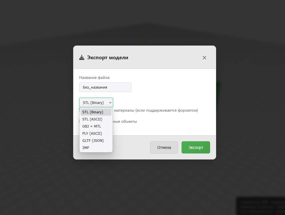 На выбор достаточно много форматов, можно сразу сохранить в 3mf. Но мне привычнее stl.