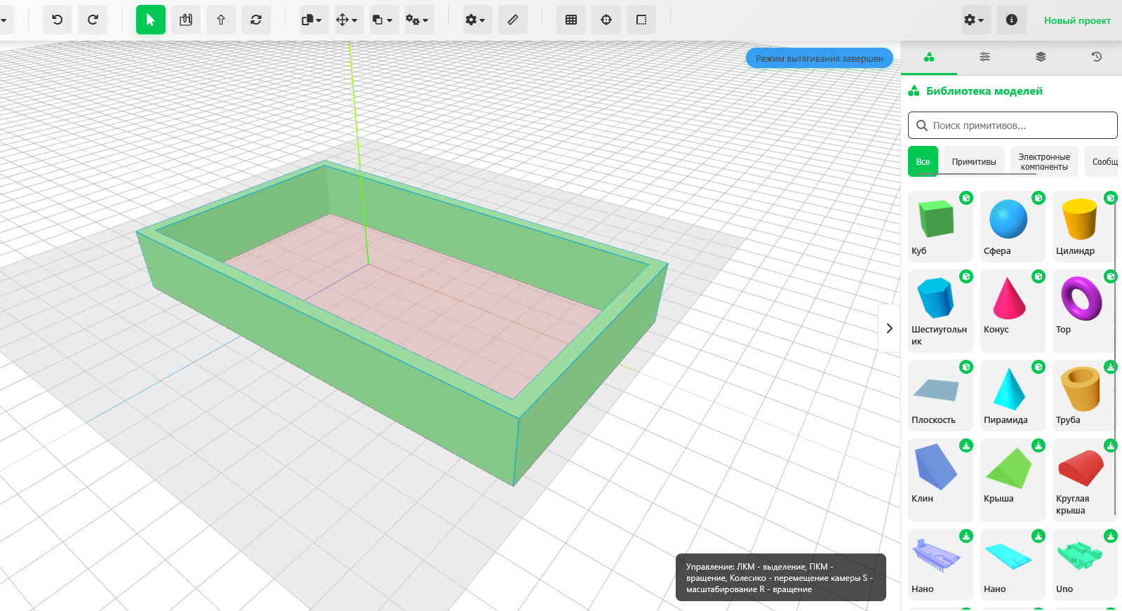 В отличие от Tinkercad, после клика по объекту доступно только перемещение.